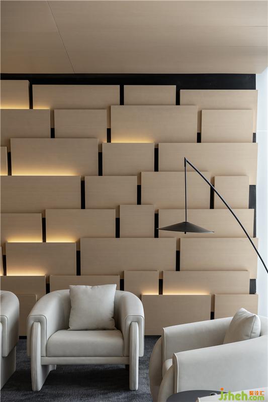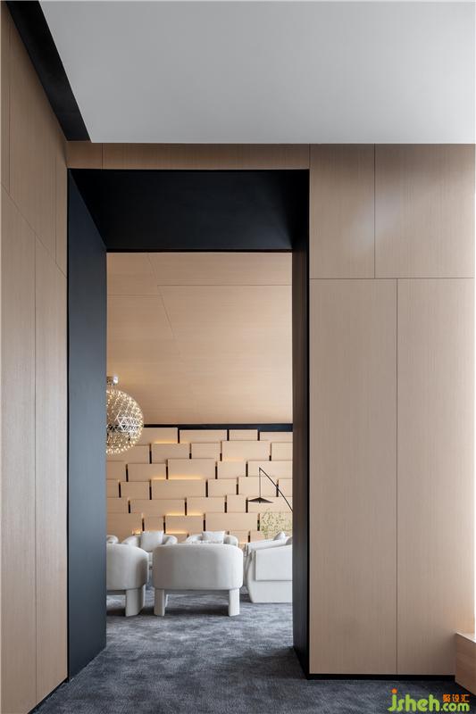三层空间围绕着中心的艺术装置,由一个个彼此独立而私密的功能板块构成,材质上延续了整体空间的调性,却切换了不同的面向,转而以木质作为墙面,深色的绒面地毯,包裹起必要私密属性,将开放的角度完全聚焦室外的景色。