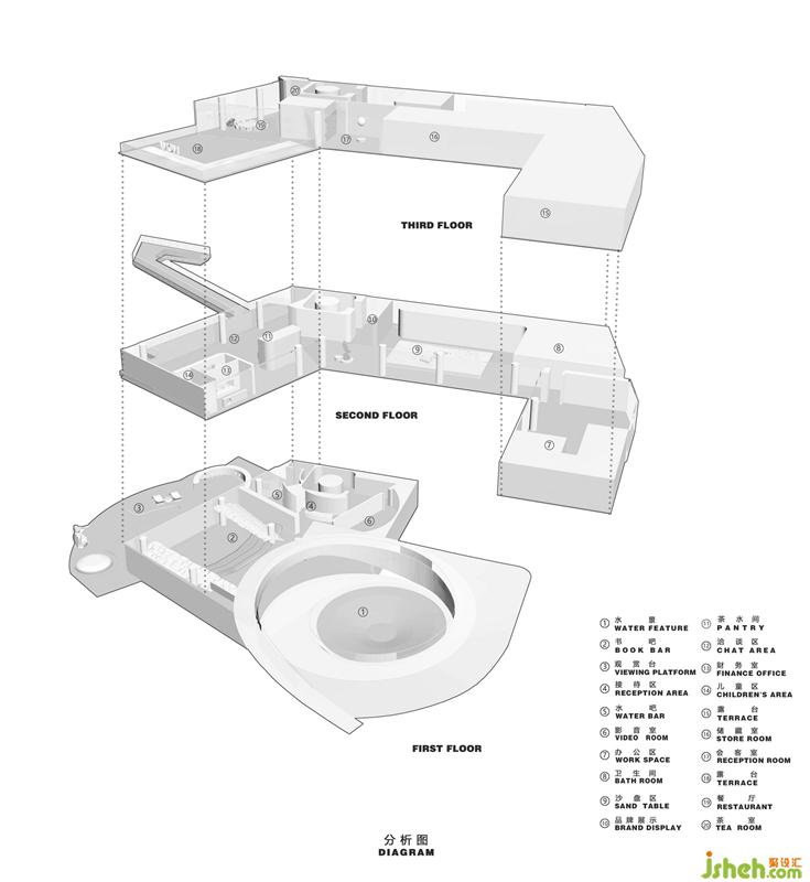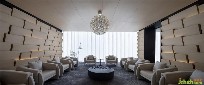 金属飘带是贯穿二层空间的天花装置,透过光影的折射为空间的纯净添加了有趣的互动,于沙盘上方也与场地所赖的“两江”线条互相呼应。