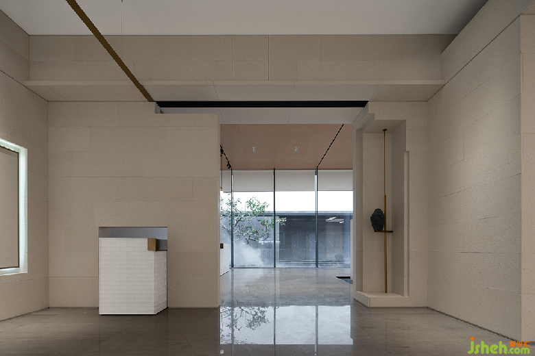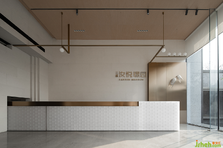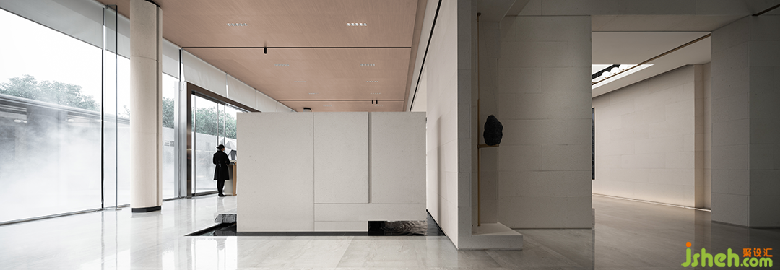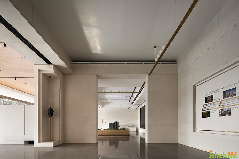 三盛汝悦璟园销售中心,地处绍兴大越路东侧。室内从零开始介入,与建筑、园林同步展开设计。建筑用围墙隔离马路的嘈杂,创造出静谧的内院式景观。售楼处室内设计与园林水景互为借景,设计师通过对景设框、借框得景,实现内外空间的渗透和流动。