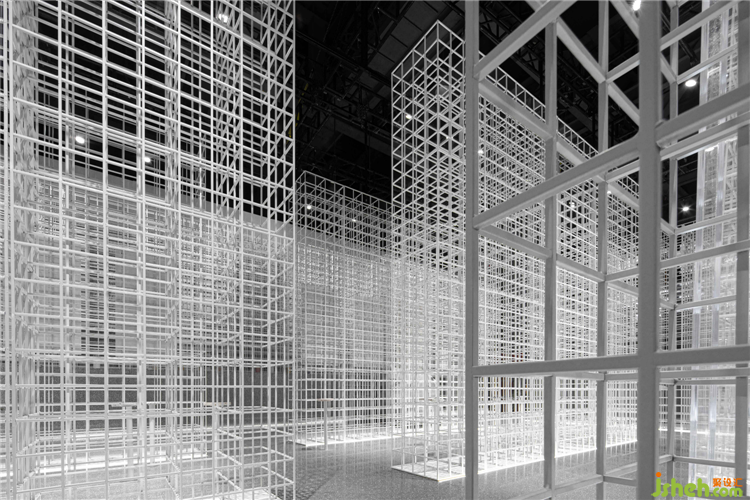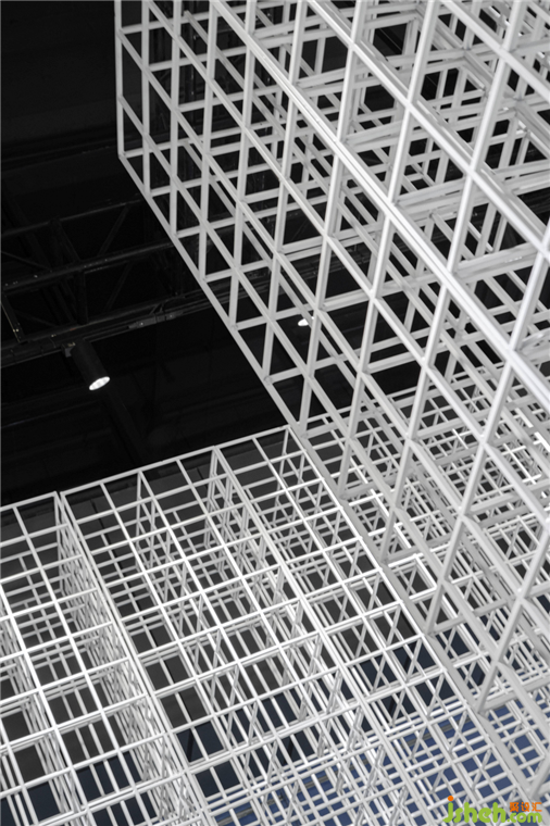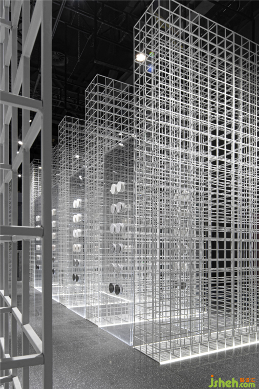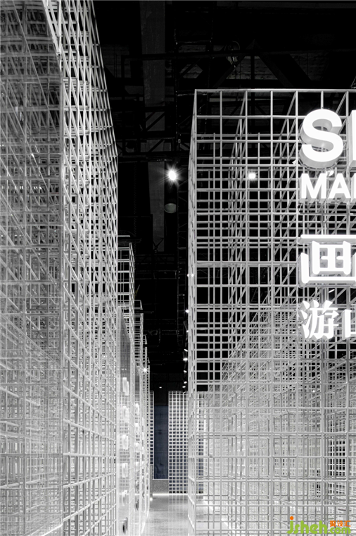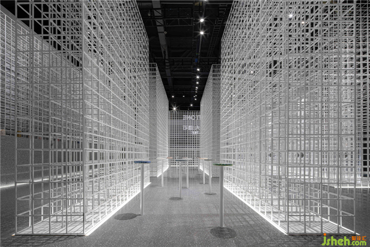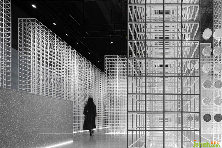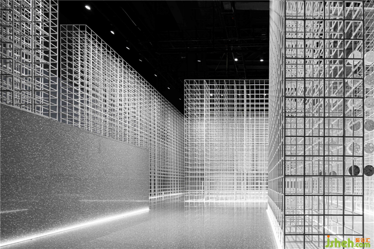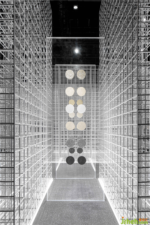我们将钢网矩阵作为展厅的基础元素,以一种交接构造呈现出最低限度的语言。这些纵横的编织形态力学结构简明,密集的叠合关系在视野上形成一种遮罩,结合运动中的视线形成线性流动的视觉效果。不同厚度层层递进,如细胞到组织、组织到器官、器官到生物体,给人形而上的想象。
