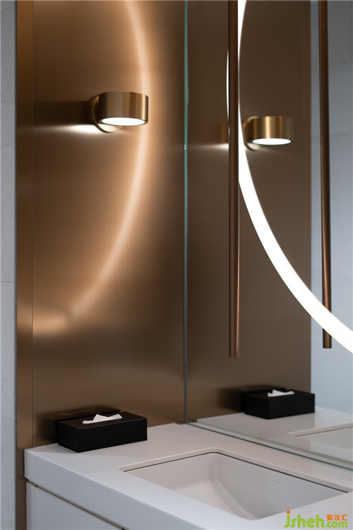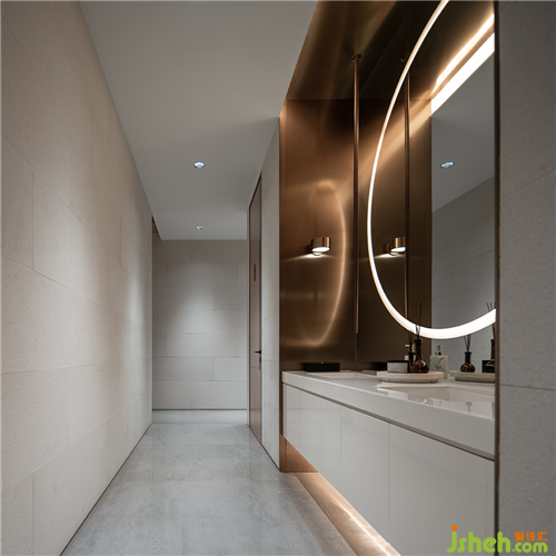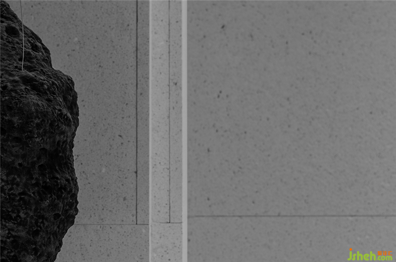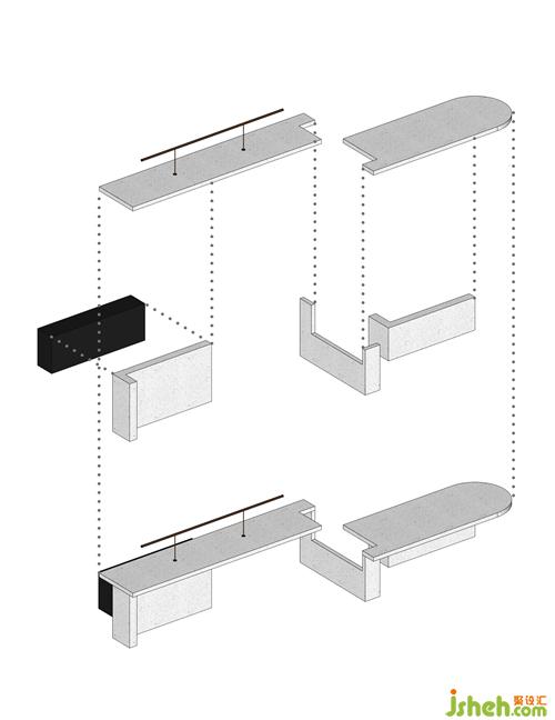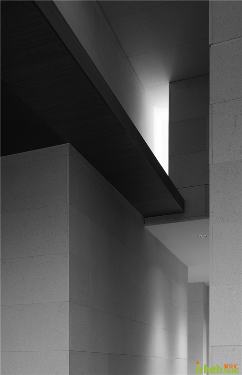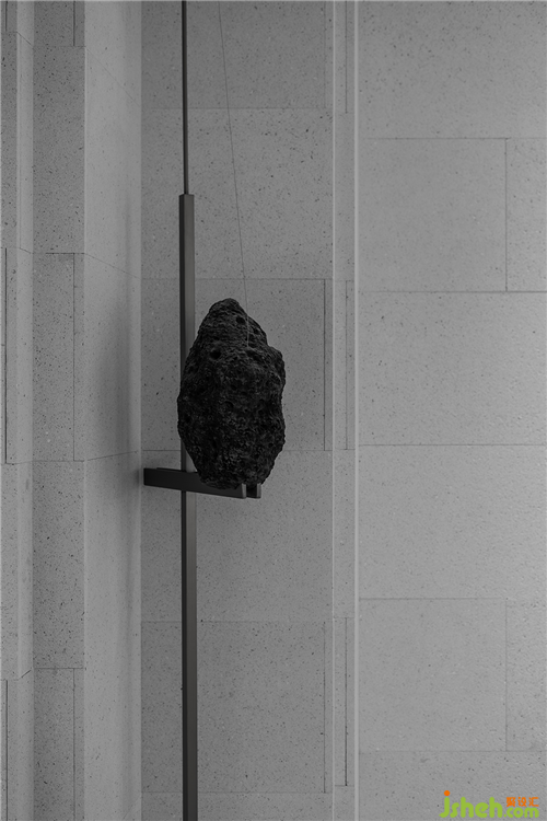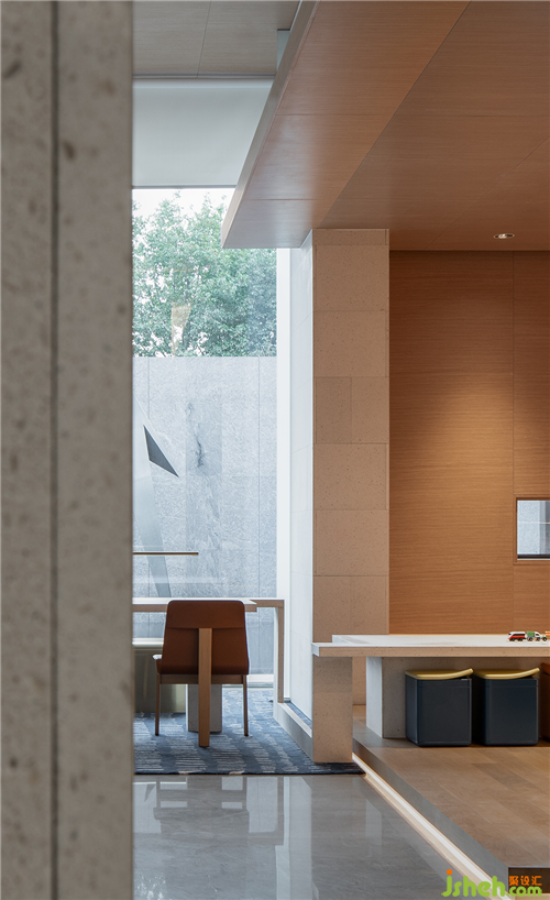 从原石,到半成品石,再到人造石板,销售中心设计师以材料建立起三重时间的演进。接待台的砖体晶莹里泛一点黄,如同稻米映照在阳光之下。砖体相对脆薄,采用室内装修的手法拼砌,砖体必不能承其重,因此改用建筑手法排砌,意外使得砖体质感更显。走廊转角处,设计师原想开一个面东的天窗,让光影可以流转,囿于客观条件未能实现。改而研发出一种水泥板,以创造从明亮到柔和的漫反射光线。水泥板采用交错咬合的方式搭砌,交接处可清晰见到材料的厚度。