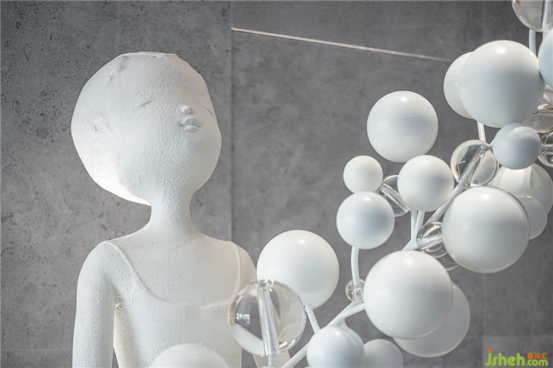 和某种逻辑相似,亦或是空间的嵌顿,对峙的氛围间,接待台的材质让空间裂隙中的用色趋向于漫射的自然光和幽微的烛光之间,结合追光少女装置轻盈的形态,成为空间中最温存的所在。