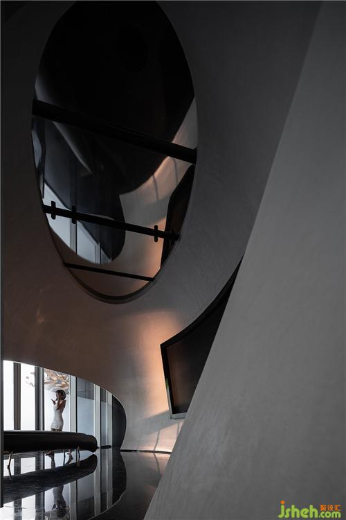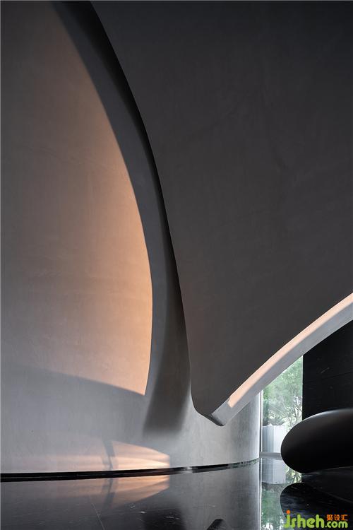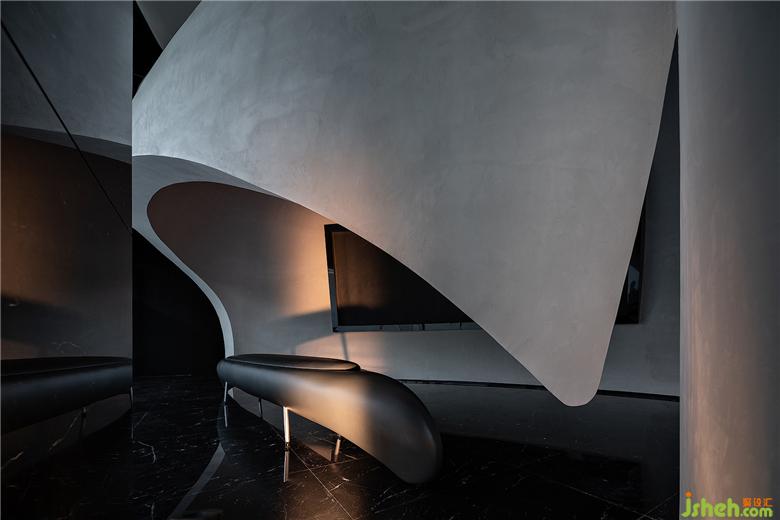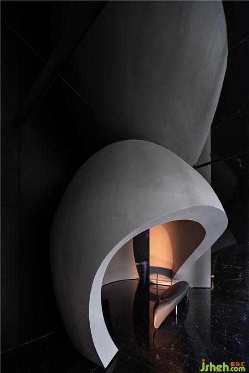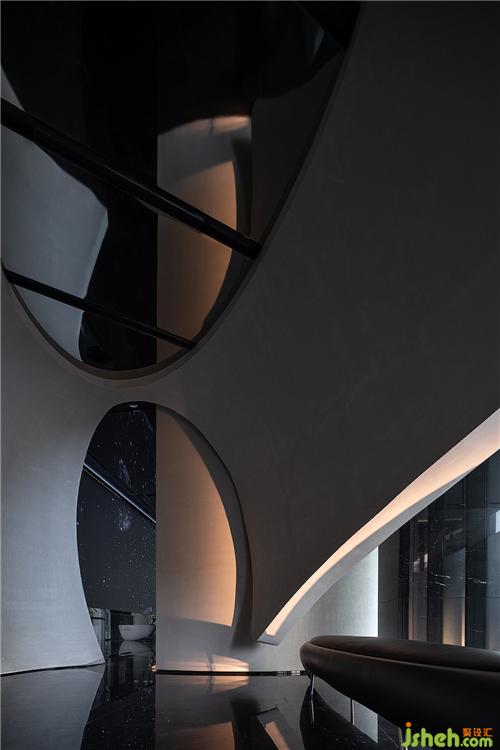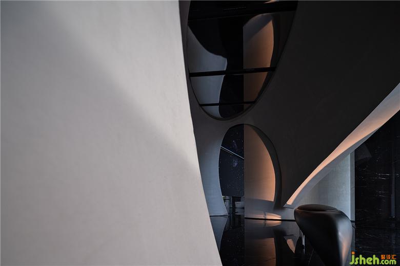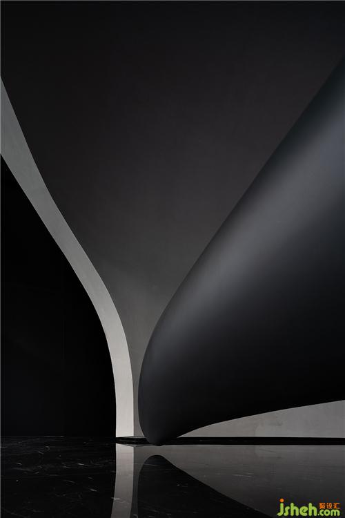 展示区设计从内部开始,弧线优雅的壳体漂浮在深色空间中,叙述着微妙的关系。