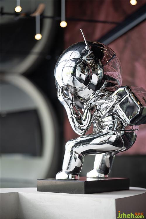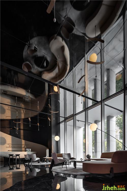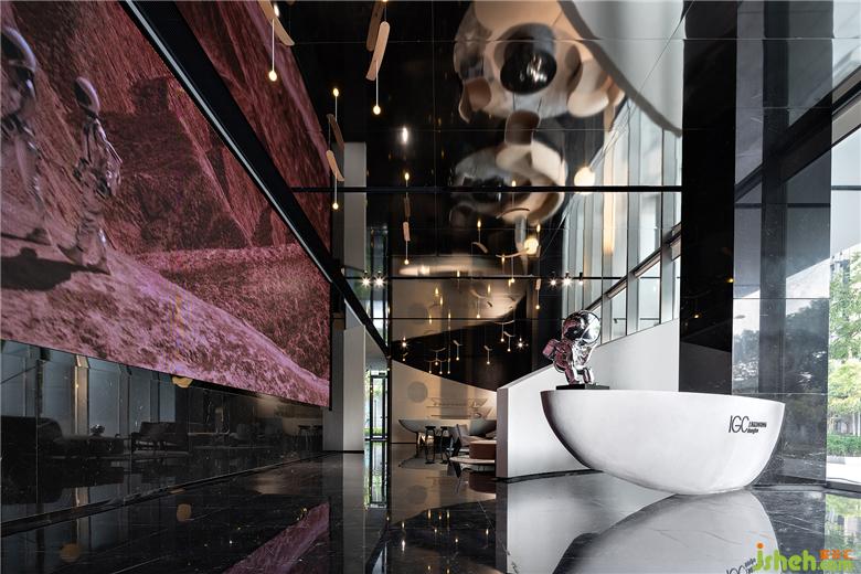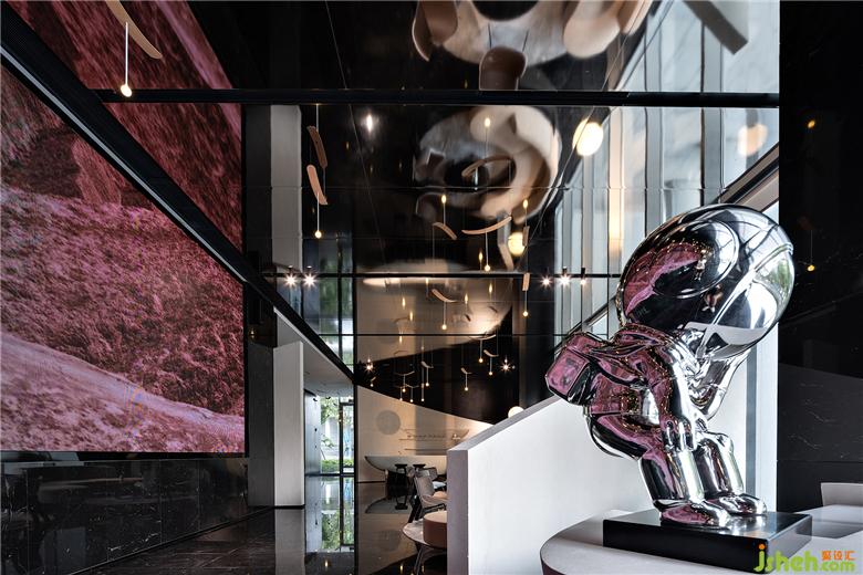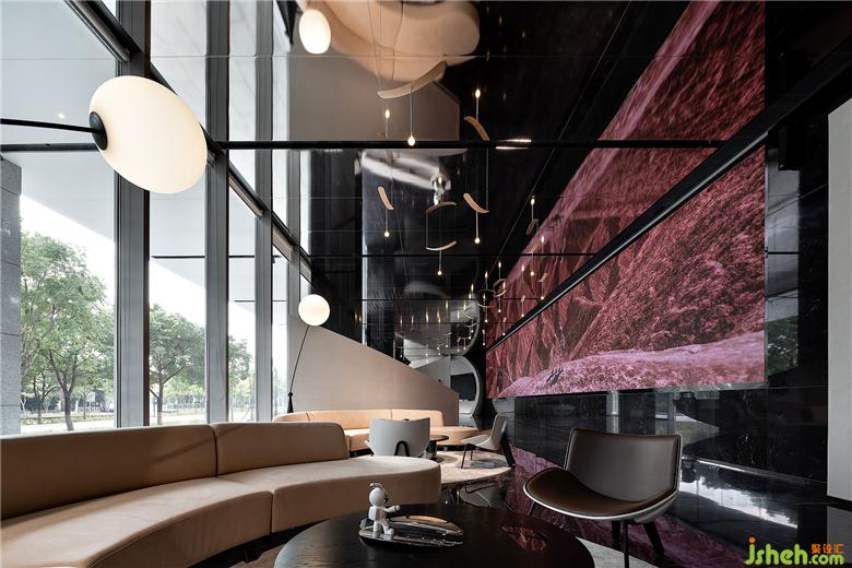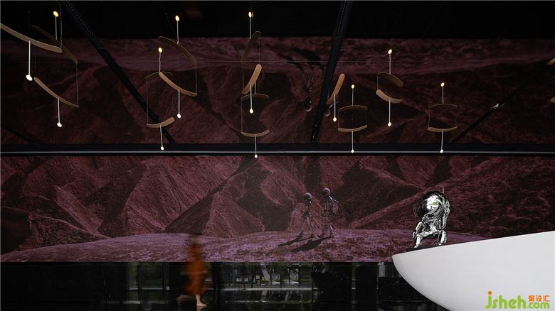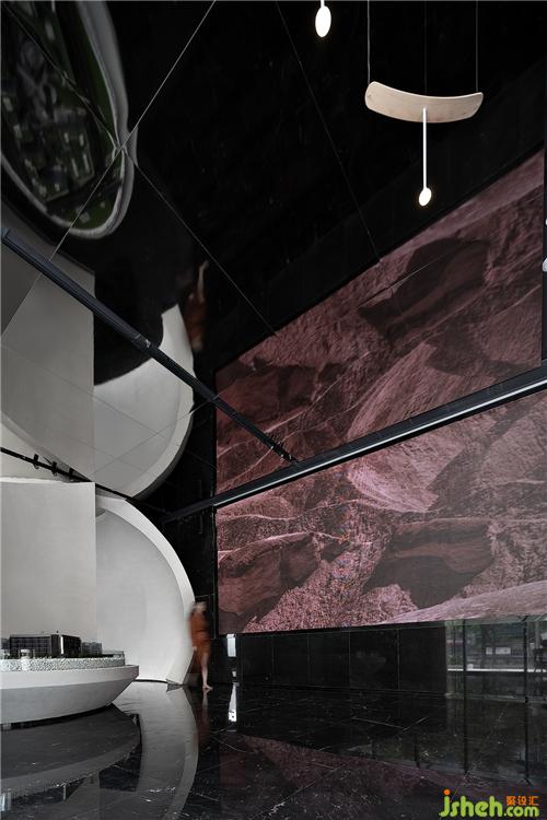 展示区设计黑色石材和镜面的结合将整个空间向不同方向适度发散,扩展着某种空无,这种空无感引发了关于风的想象。