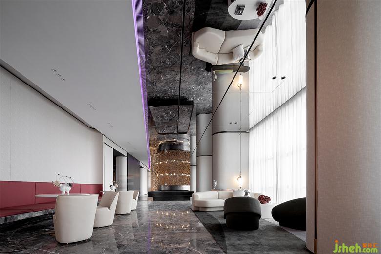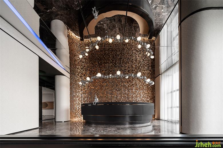 核心筒一侧的镜体墙面与空间产生镜像投映,形成一虚一实两个空间的叠加。