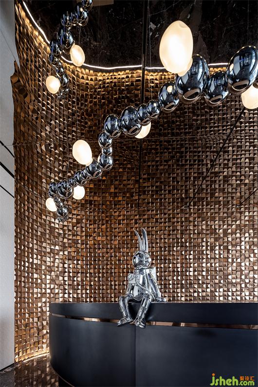 上到十五层,首先要经过一个艺术长廊。深邃的太空灰为顶,圆形孔洞在顶面上方以阵列的方式延伸向前。