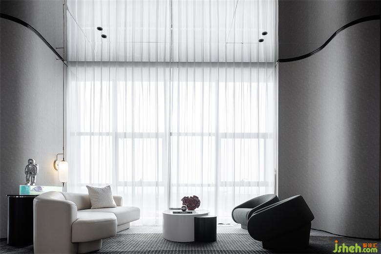 营销中心设计座椅的摆放布局,呈现灵活且丰富的形态,一改传统售楼处一排散座的僵硬感,自然而然地呈现出应有的社交性,召唤着人在空间中的参与感。因为层高的限制,设计师通过天花镜面材料改变空间狭长的姿态,强调着窗边造型柱的秩序感,制造着漂浮且没有摩擦力的体验。
