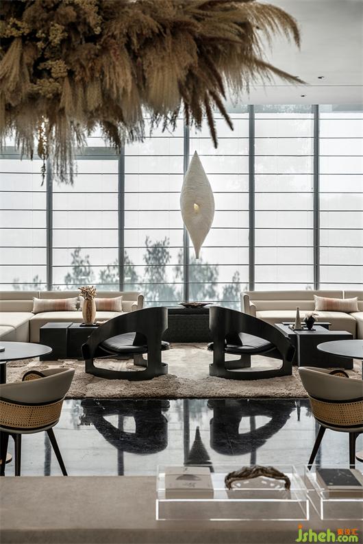 美的半岛山水庄园销售中心作为首开区的重要公共空间,它是项目与人群沟通的第一界面,在公区设计功能上,既要满足销售中心的功能,亦将作为后期项目酒店的公区和大堂持续地运营和开放。因此,这片场地的设计,承载了人们对于未来生活方式的想象,更需具备一定的开放性,包容未来空间行为场景的转换。
