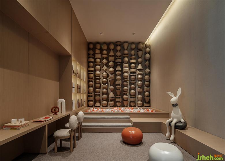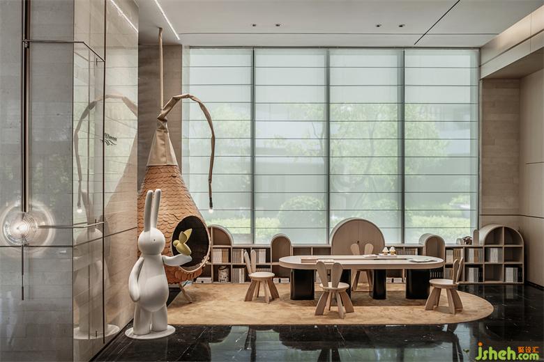 在后场空间中,公区设计以水吧台为中心的回形动线,连接起深度洽谈区、私宴、茶室和儿童游戏区,包裹的空间,产生了更为贴近的人际关系。