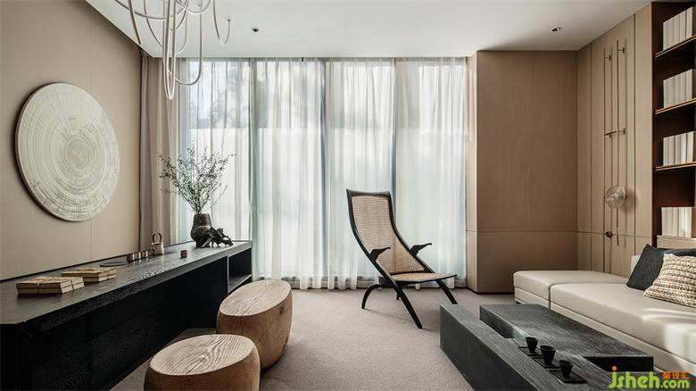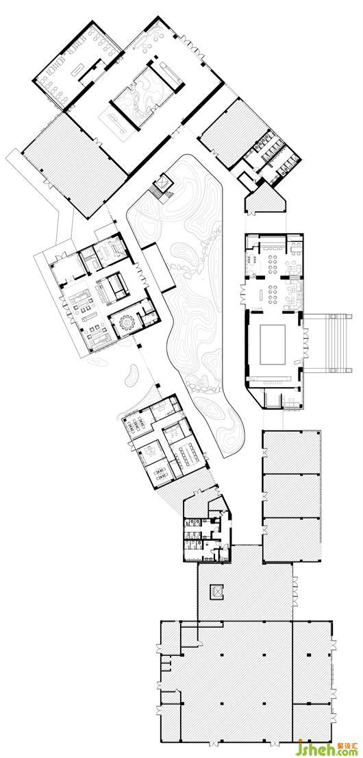 公区设计场地以四座彼此独立的建筑,如同微缩的“村落”般围合,这样的布局策略并非仅服务于形式,而更在于提供一种与自然相伴的、湖居生活状态和设想。