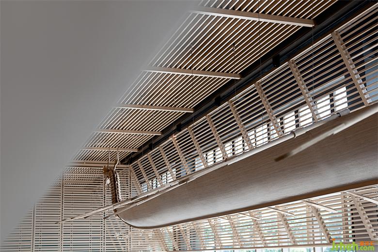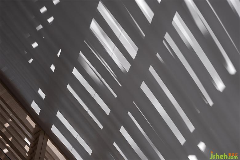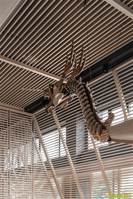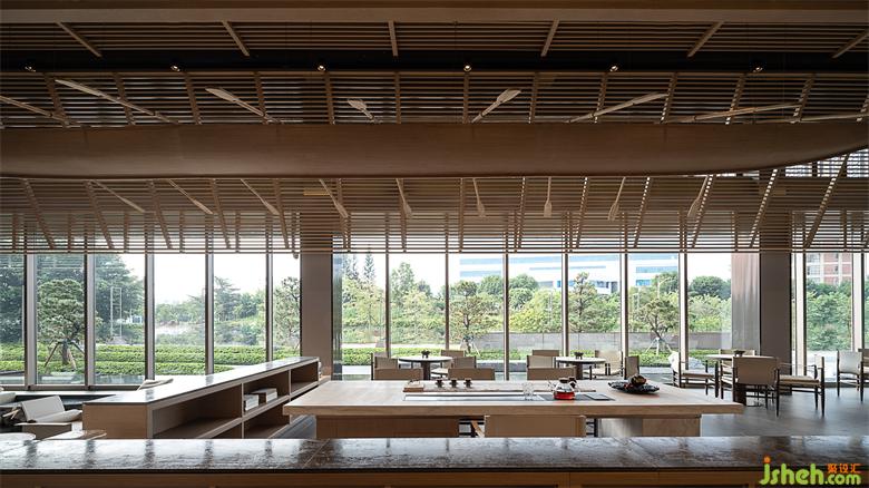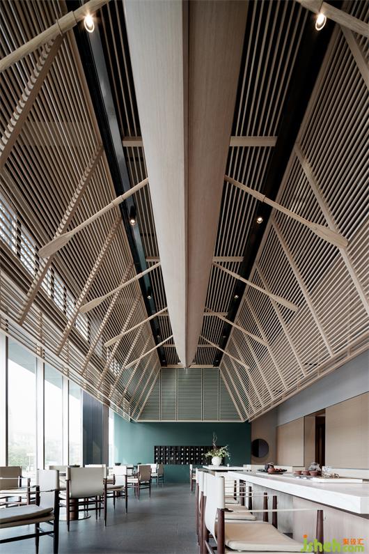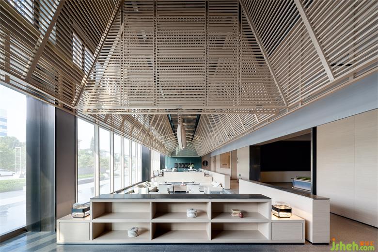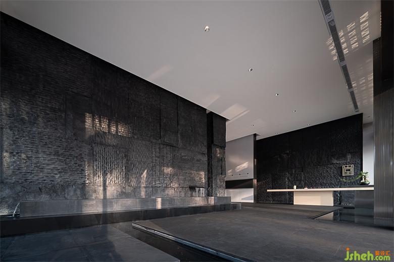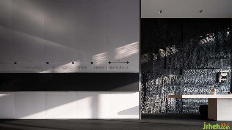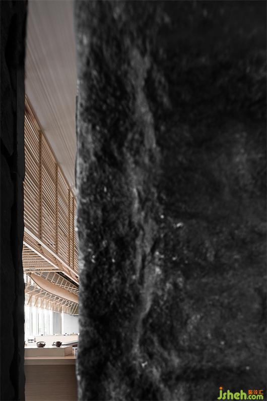 从门厅的岩间潺潺流水开始,体验的基调变得安静。循着弥散的茶香、琴音,岩壁上开凿的肌理交错并置,石的斑驳穿越时间裂隙,和鸣成曲。简化的叠石、筑山、理水概念将“空”隐逸于石林水泽之中。随行进轴线展现的是隐逸都市的茶室场景,营销中心设计整个空间是徐徐展开的状态,与自然的关系进一步延伸至材料层面。