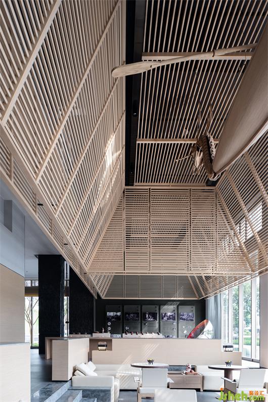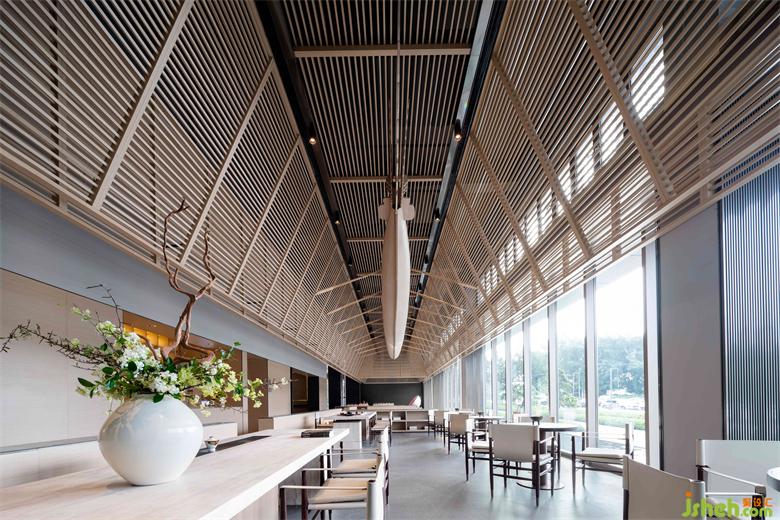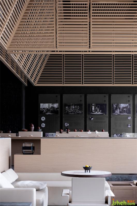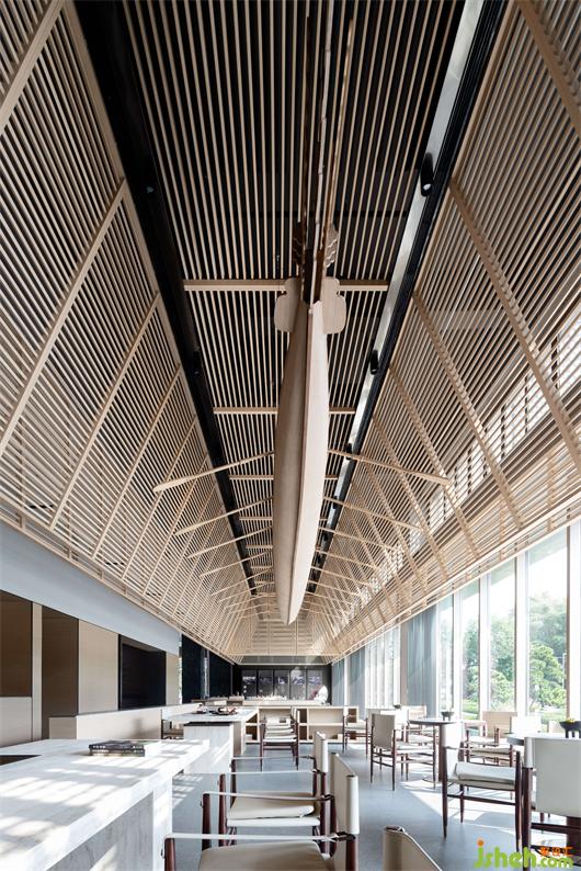 在下沉的洽谈区,视线自然降低,自顶面笼罩的木构宛若茶亭。取自清溪当地传统竞渡的龙舟凝固成一种想象,品茶之“静”相较于龙舟之“动”,如涟漪之于水,激发着心灵和身体的感知。