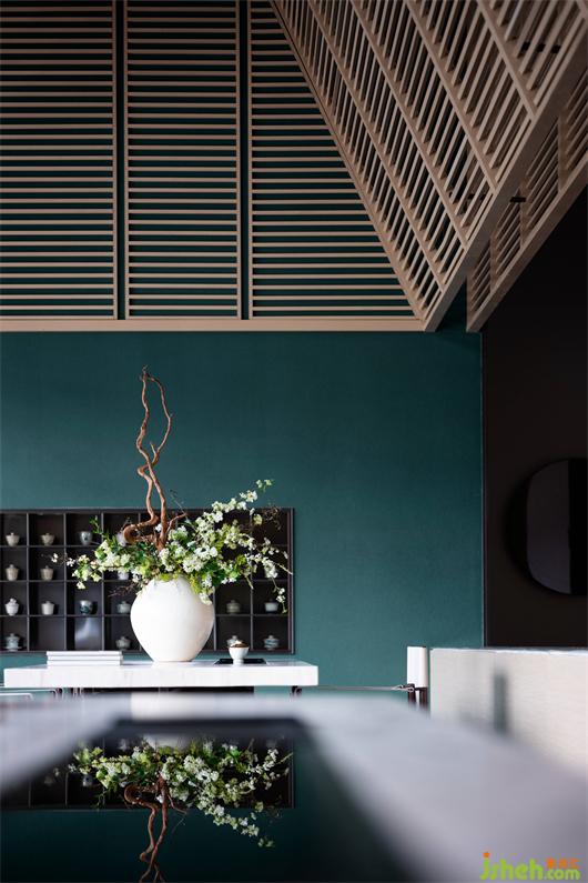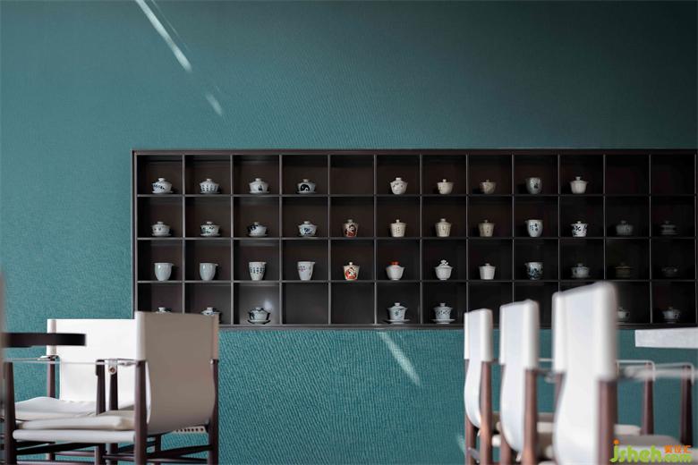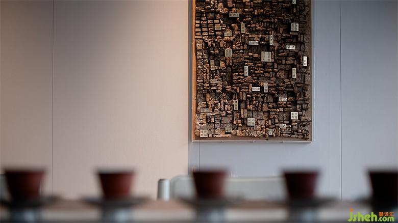 人群之中,自由主义意兴阑珊,多是泛泛的交谈。茶为人们打开了一个“唯心”的窗口,心外无物,言浅意真。营销中心设计作为端景的各色茶具展示在洽谈区两侧,日用即道,形而上悟道。虽是先有茶再有茶器,但茶器却反过来升华了茶。