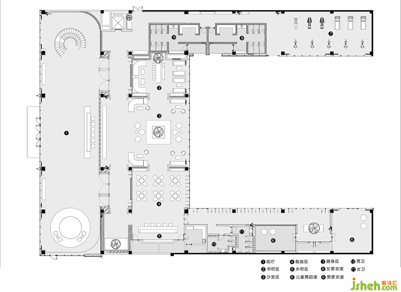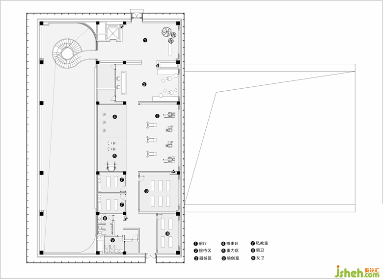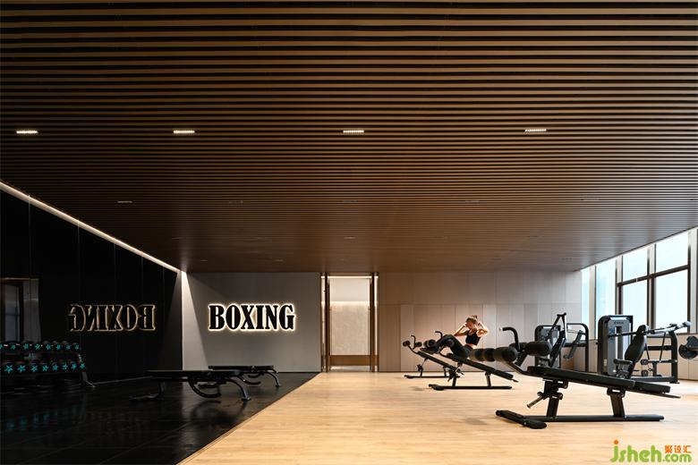 在健身区的设计中,大面积的自然采光配合各区域不同健身主题的背景墙,再辅以顶部线条的运用,营造出一种缓缓流动的秩序感,在简单的符号语言之间,讲述空间的精神与状态。