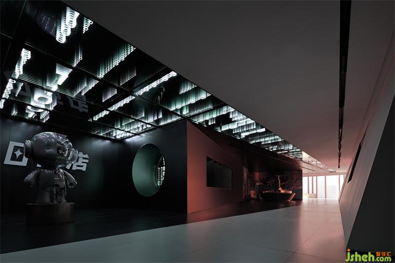 空间设计通过一条黑白切割的走道,招商展厅设计将象征虚拟世界的黑与代表现实生活的白,并置在一起,产生饶有趣味的空间碰撞。