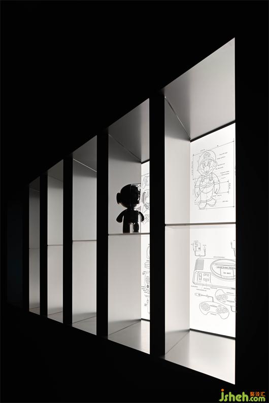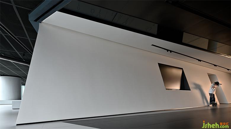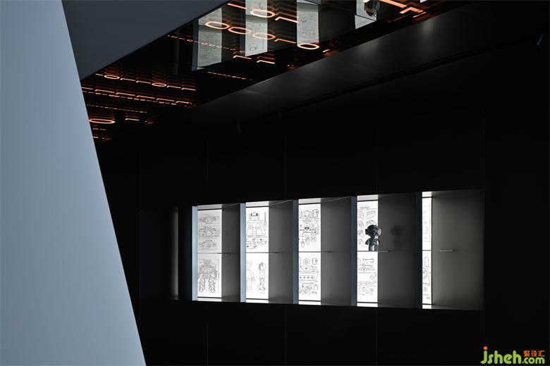 转折后的空间顶面被处理成镂空的黑色网格,退隐至边界之外。