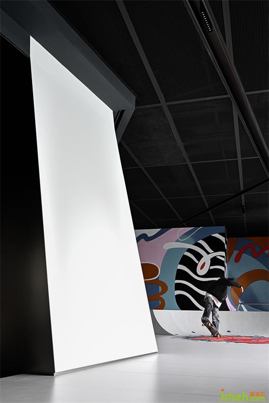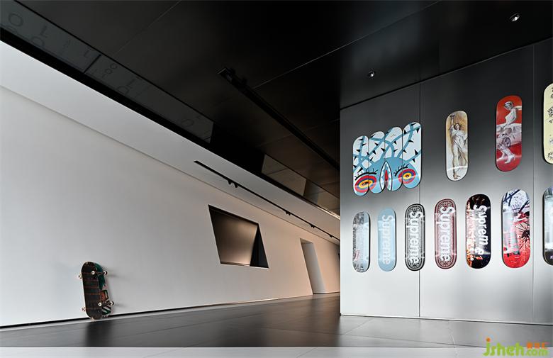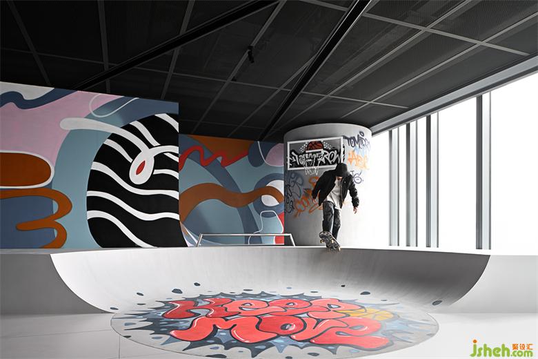 招商展厅设计师利用走道尽头直角转弯的开阔空间,构建了一个户外滑板与街头涂鸦相融的社交性空间场域。
