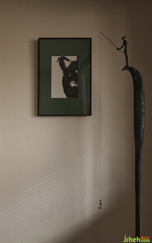 佛山别墅设计视觉界面彼此穿插,亦动亦静,时间就此趋缓。相对开敞的多功能空间中,长台在平面上构成一种舒展,与立面结合,鱼的主题贯穿其中,无声地演绎某种动势。