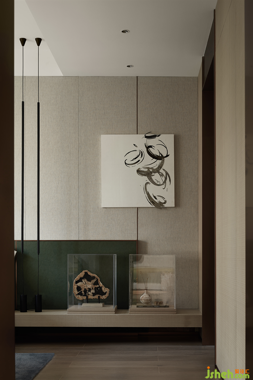 木纹和肌理中,墙面硬质元素的介入释放出些许爆破感,作为点睛之笔,让人从无意识的体验,到有意识的关注。