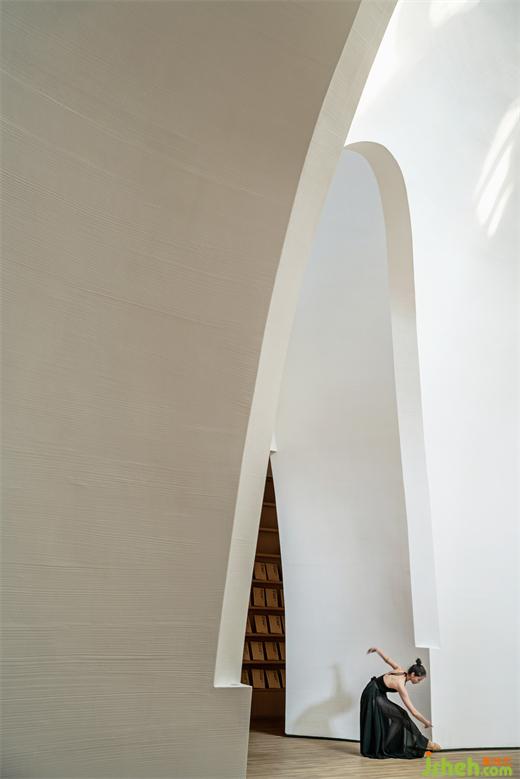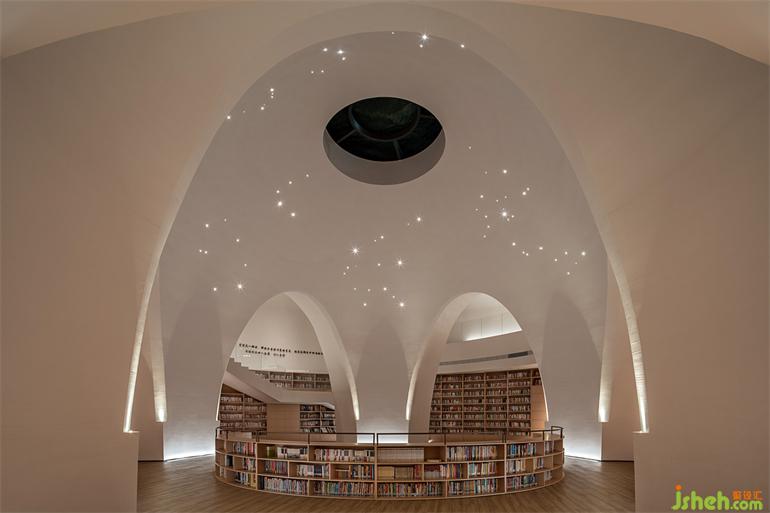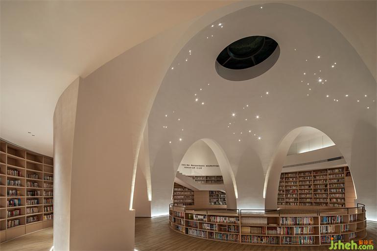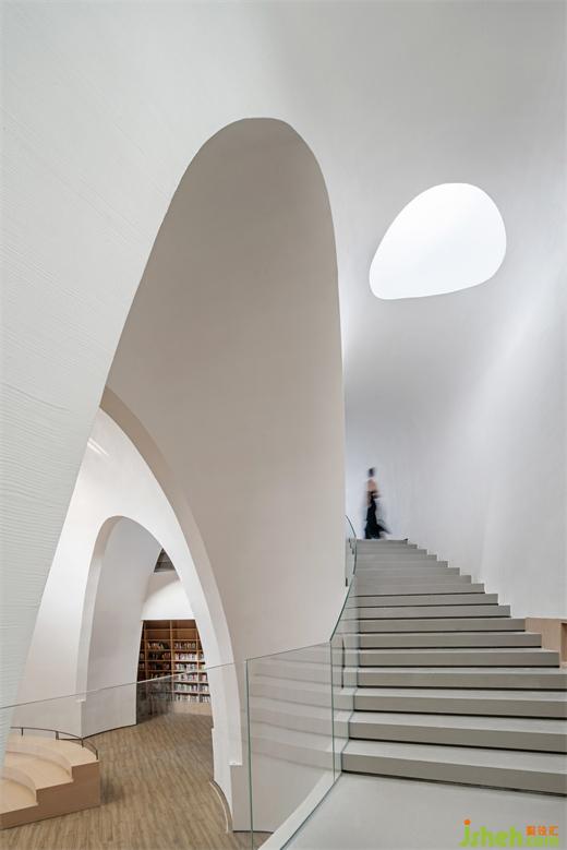 相对纯粹的色彩表达结合轮廓弱化了柱体。在整个半弧形空间平面的尽端,是通往负一层书吧的入口,一片隐秘的星空静待开启。