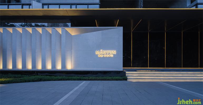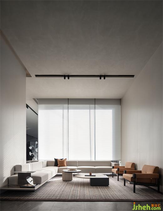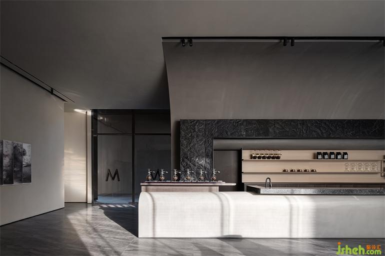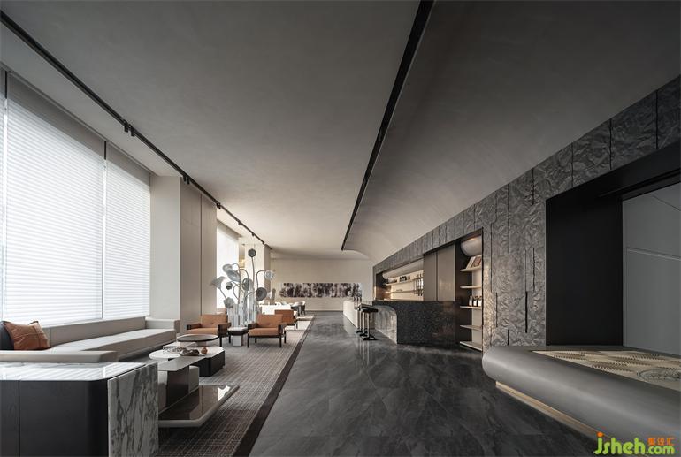 销售中心设计从灰色的前厅进入,整个空间平面疏朗平缓,区域的形成并不依赖确定性的边界,更多是由空间的场景感所引导。