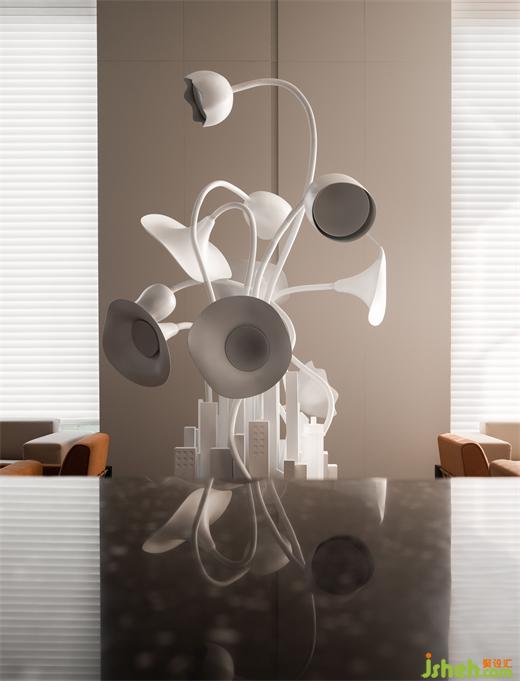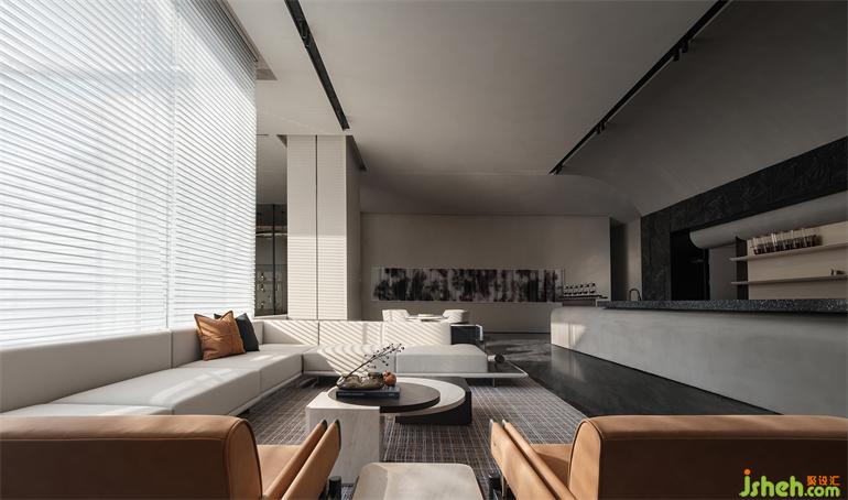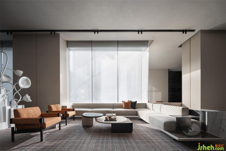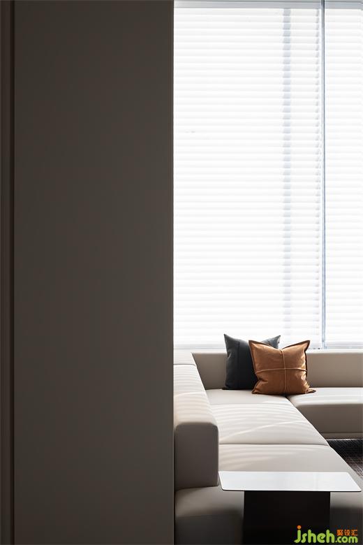 沙发座椅区位于沙盘与咖啡吧台的对面,这里的空间重心开始微微下移,巨大的玻璃幕墙在其后,投下温暖和煦的光斑,一种安静的情绪萦绕其间,暗示为某种柔软的、可以安放心身的归属感。