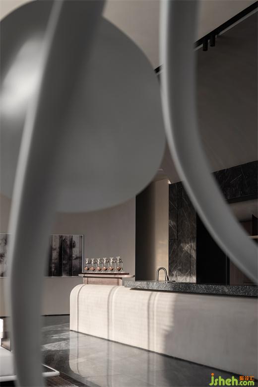 沙盘区域咖啡吧台在前续的位置上相连,确立着空间动线的方向。与此同时,巨大的微水泥弧形曲墙面构筑物,销售中心设计将沙盘与咖啡吧台微微向内包裹,营造出轻松而熙攘的都市街头氛围。