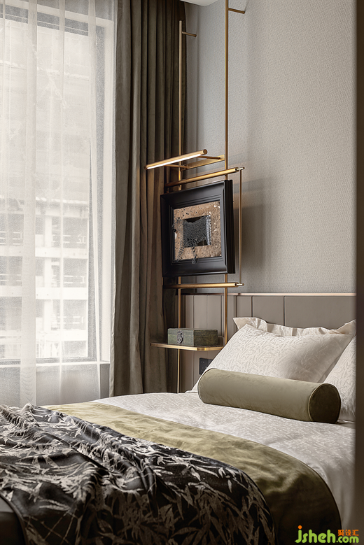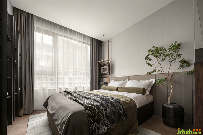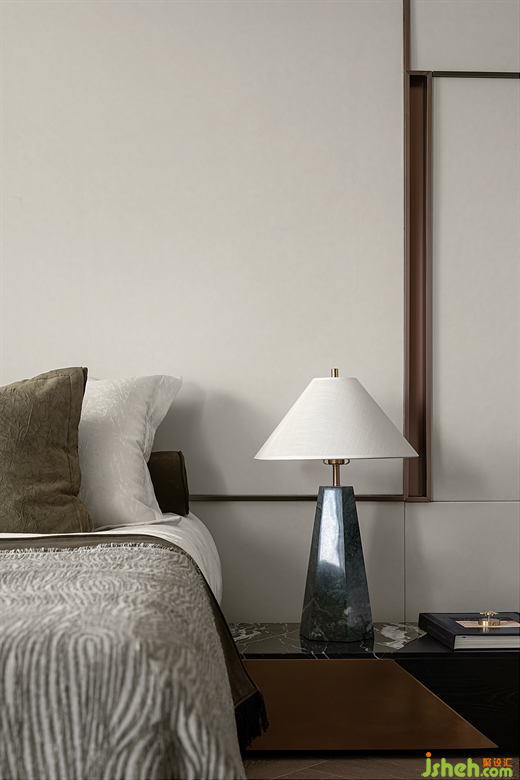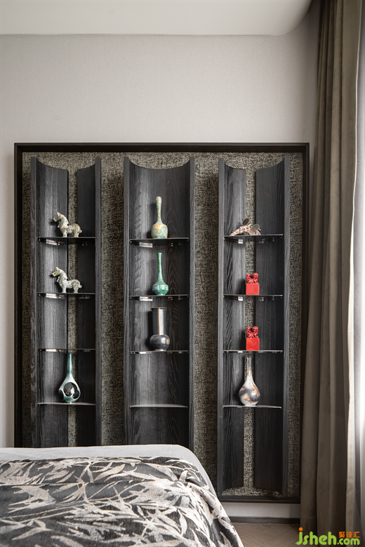 如隐匿于山川风月间,次卧趋向沉稳的表达。乌木陈列架与墙面呼应,某种场域独有的精神性提升了空间的庇护感——设计师试图阐述一种“温厚的情感”,来安放自然中隐藏的情愫。