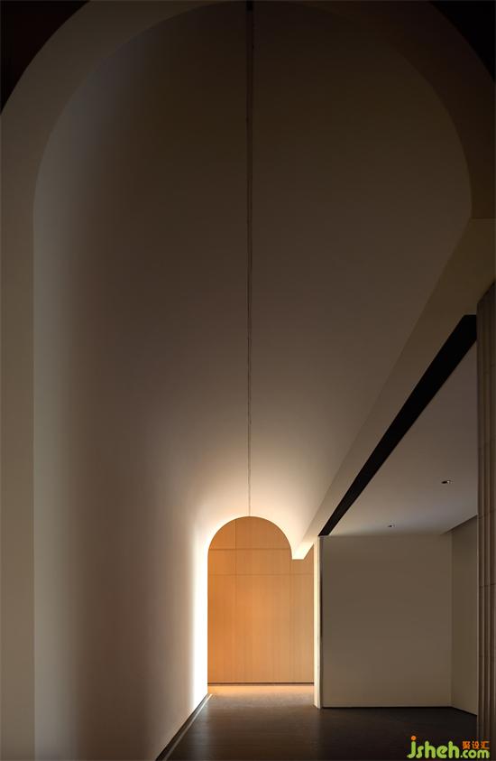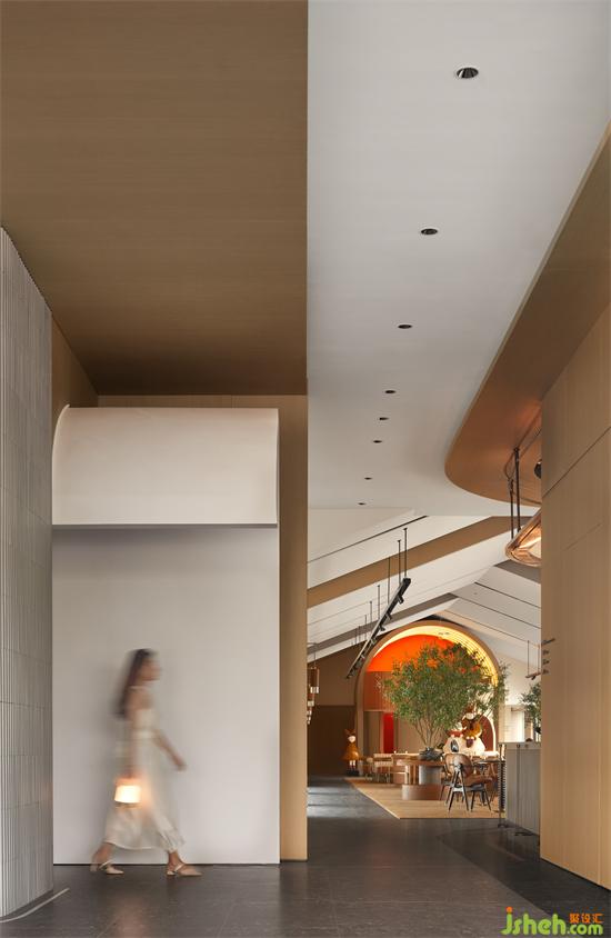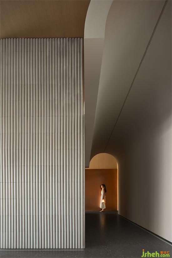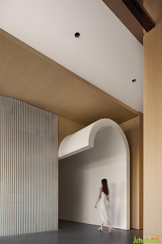 穿过沙盘区,是一个进深大的长空间,设计师顺应屋脊的形态,在顶部采用层序叠进的手法,销售中心设计形成体积感,将视线收拢于中轴,黑色灯带嵌于其中,温暖朴素的木元素与几何、线条语素完美结合,勾勒出空间的仪式与秩序。