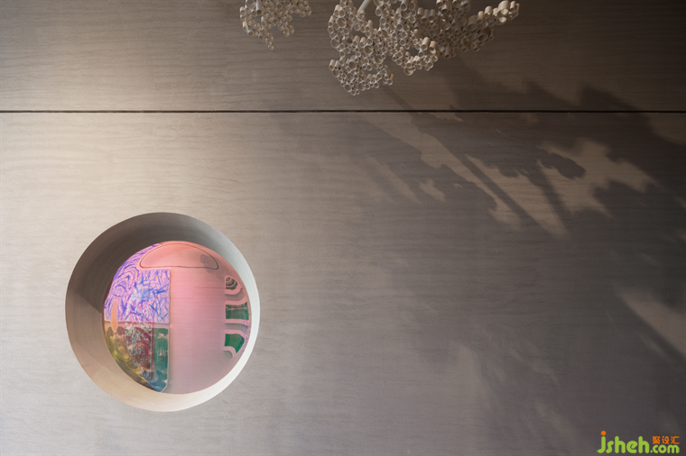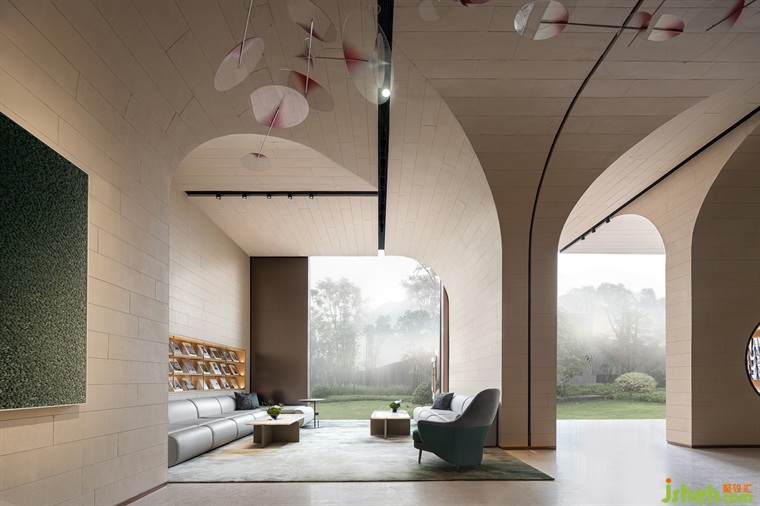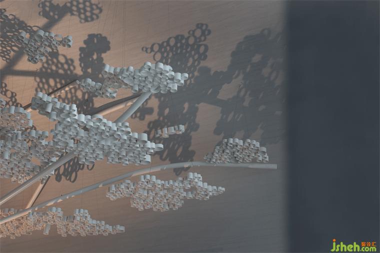 空间中的枝与干,顺势伸展,自然地切割、停顿、转向,围合出不同的功能空间区域。会客大厅、临时沙盘区、洽谈区、水吧、艺术展览区、休闲区,自然地散落其间,在开放与半开放中营造空间场域的多重形态。
