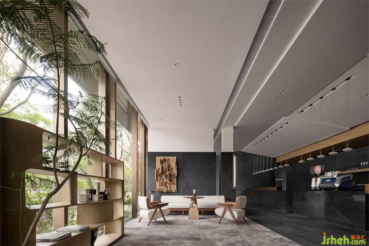 坡屋顶位于空间主轴的区域,从吧台上方一直向座区延伸。由于层高的限制,北京售楼处设计师选择以白色释放空间高度,呈现出一种干净、平缓、通透、开放的顶部状态。