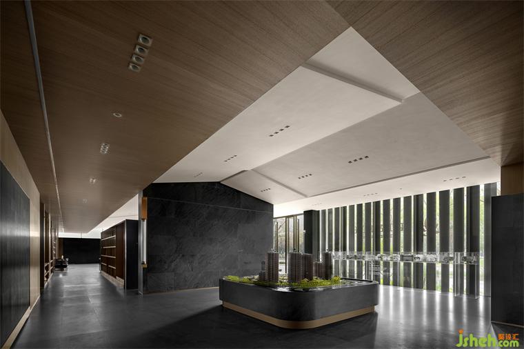 大量有着自然纹理的暗色大理石,平铺整个地面并向四周墙体攀爬延伸,北京售楼处设计以此完成空间在水平维度上的视觉延伸。在垂直方向上,暗色大理石巧妙地与白色顶面保持着适当的距离,一明一暗一张一弛,于对比中建立起空间的感知尺度。