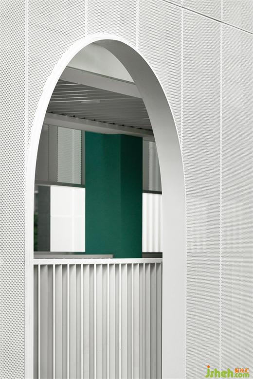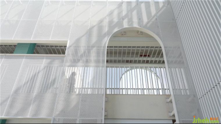 幼儿园设计金属冲孔网如纱网一般,轻盈而具有呼吸感,既有效地遮盖了原建筑结构的缺点,又因空隙过滤着光的形态,捕捉着光影的变化,而金属冲孔网上挖出的圆与椭圆的造型,则更进一步丰富了摇篮的具体形态,并使之趣味盎然。