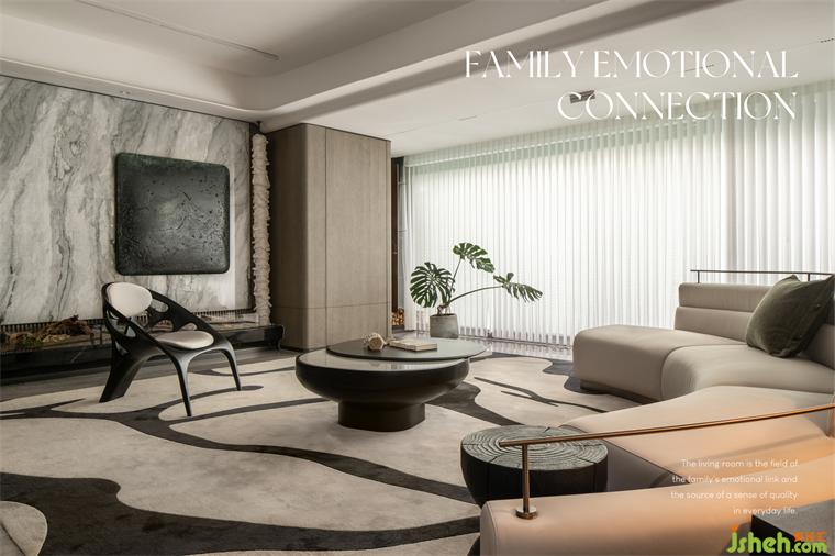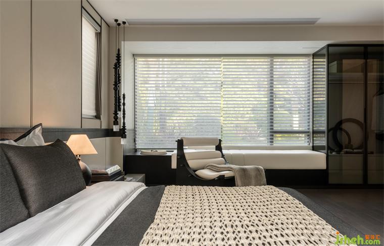 颜色、材质、光线恰如其分地调和着空间的氛围。深色夯实致密,稳定着空间的情绪;浅色素洁淡雅,大面积地延伸着,带来深长而均匀的呼吸感;阳光于左右两侧玻璃窗照射进来,百叶窗的影子里,仿佛也充满了隐秘的流动的力量。