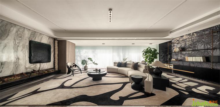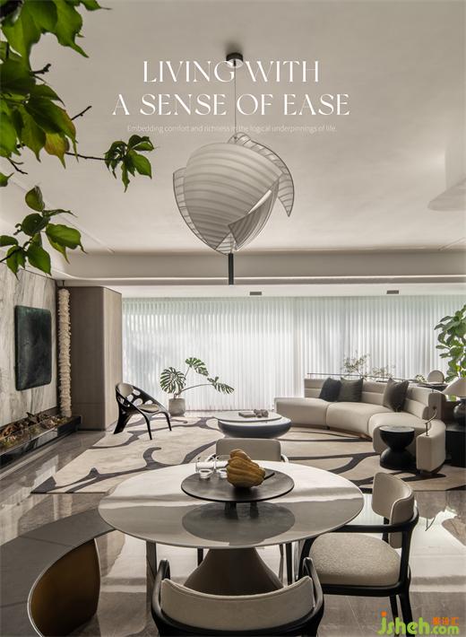 样板间设计将原有的封闭式厨房打开,延展整个客餐厅在视觉上的纵深关系,形成一个延续性整体,并在区域功能的逐渐变化中,产生一种由紧向松疏导的空间秩序。