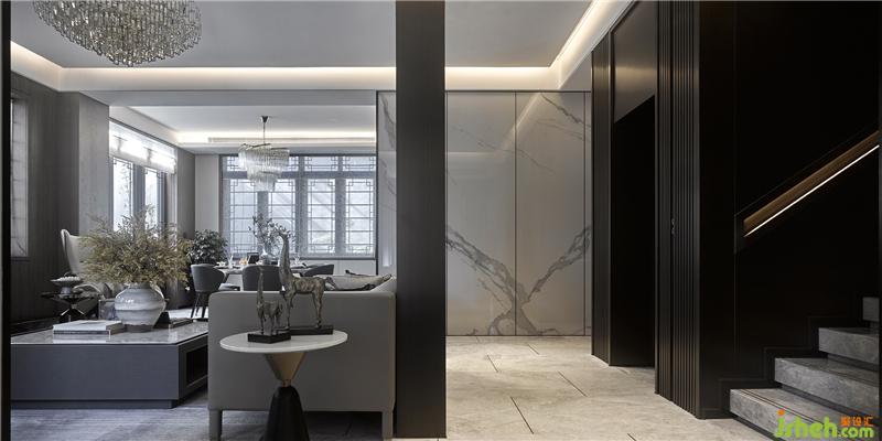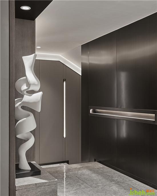 餐厅与厨房间的拉门不落俗套地以哑光仿古不锈钢镶边,规则磨砂肌理的艺术玻璃为饰面,含蓄内敛。而条纹状仿古铜不锈钢同样运用于电梯过道墙面,暗稳的光感悠韵深邃。别墅样板房设计