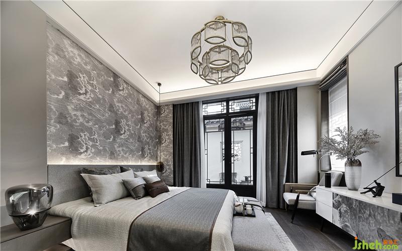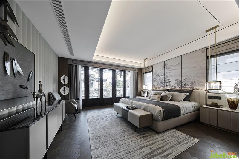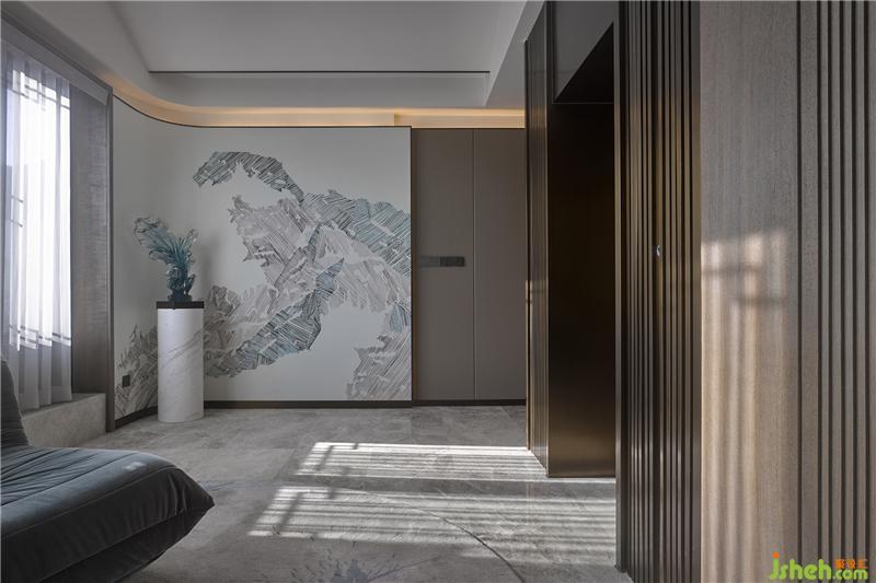 走上楼梯,私密的卧室空间隐藏于此。主卧窗明几净,宽敞舒怡。春江绵山闲亭聚的悠奕景象依附床头墙上,剩余墙面则选择弧形布艺硬包,意味深远。