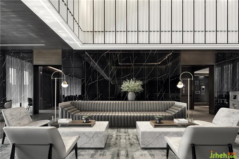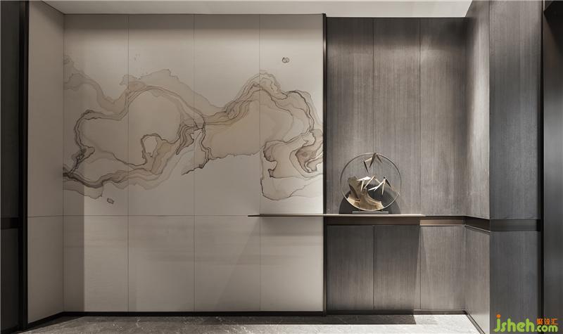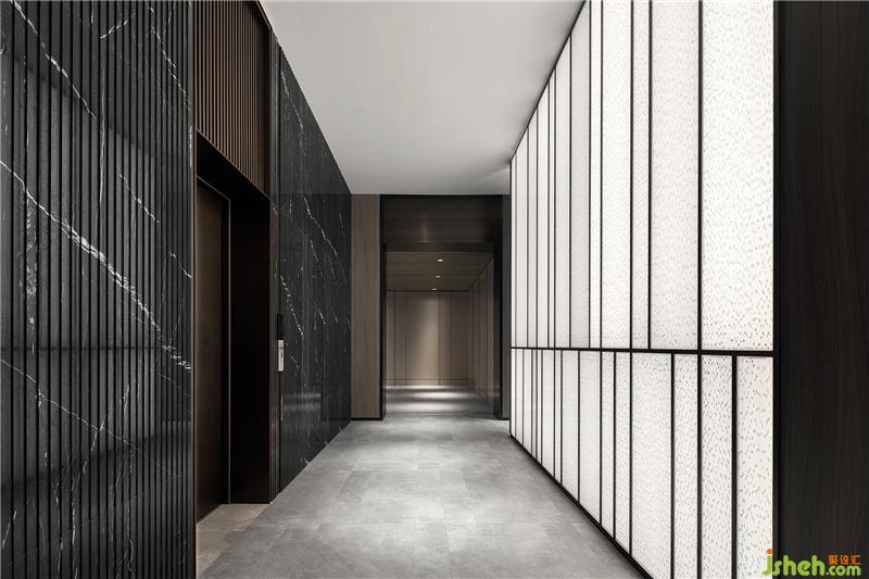 电梯间延用了水波纹不锈钢吊顶,宛若运河趟过,蜿蜒而来。如水墨晕染层叠交错的艺术布面依附在过道墙体上,“运河水”的不同姿态在整个售楼中心蔓延,独具匠心。