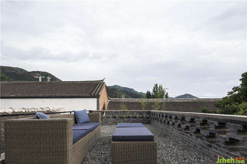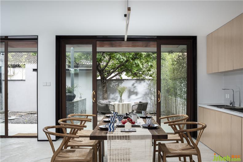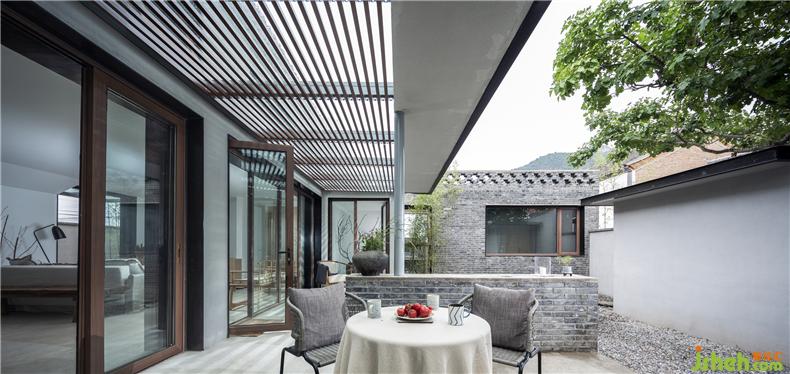 为保障户外活动无惧阴雨和暴晒,建筑在南向设置了玻璃雨棚,并以木格栅形成光线的过滤。室内设计师同时,灰空间的留存是对传统建筑形制“风雨连廊”的追忆,兼具功能和情感价值。