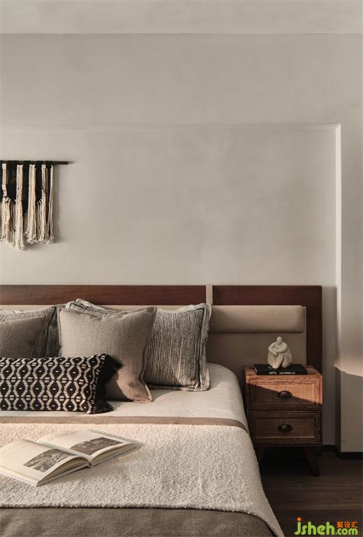 好的居住体验离不开全时段的关照,回归舒适柔和的卧室语境,人们向往更加私密、不被打扰的状态.在卧室空间中,民宿装修设计以更细腻温暖的奶茶色统领基调,加入更多的棉麻和陶器的温润,在轻盈的二层空间营造出属于个人的心灵港湾.