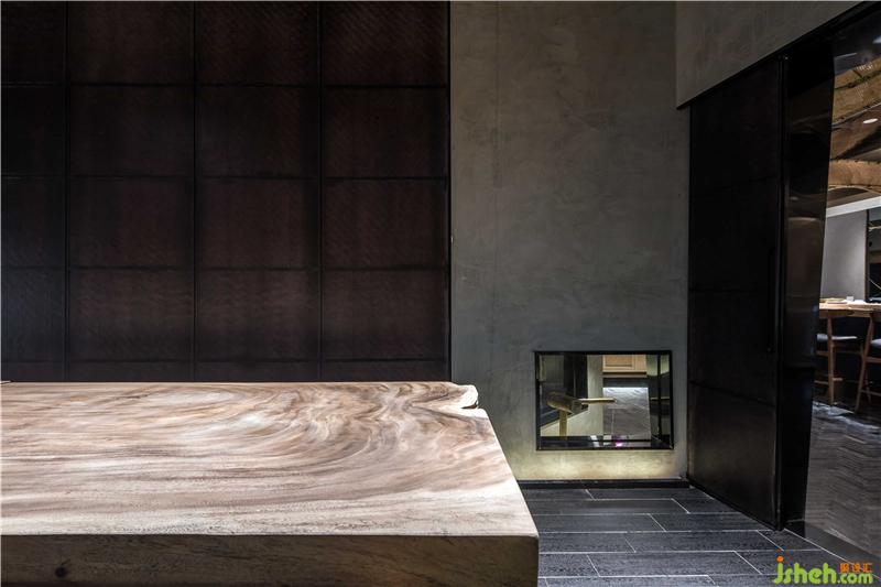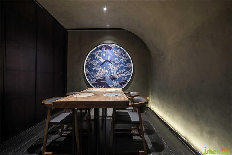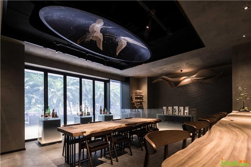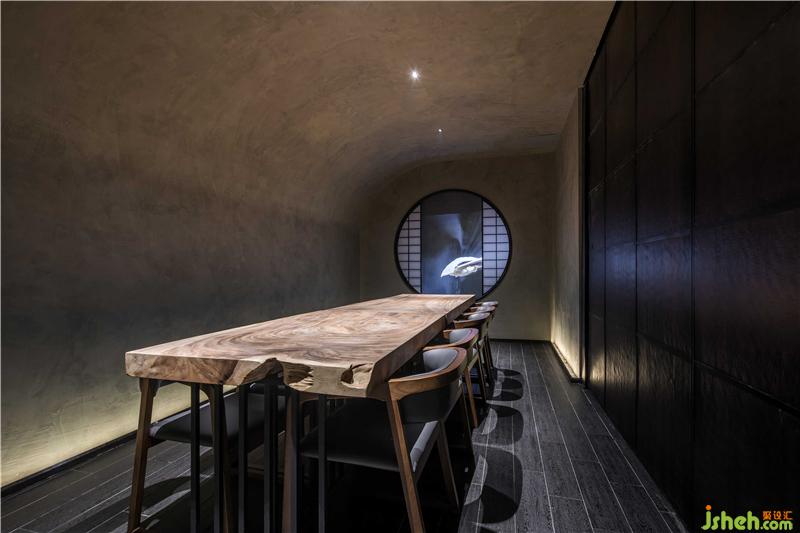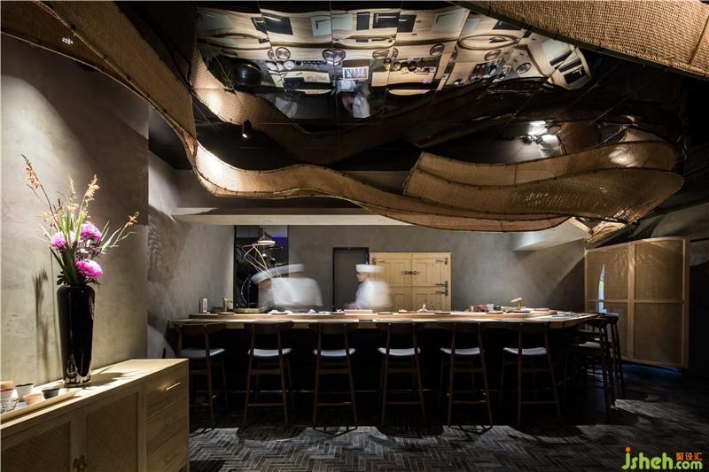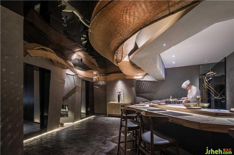 本项目位于广州最繁华的淘金路街道,是一家类怀石风格的日式料理店。怀石料理简单而雅致,同时讲究环境的清幽,茶食“和敬清寂”,尊崇自然,更多强调包容性。为更加的体现出日式料理中食物自身的特色,《旨匠》在设计上采取了极简的装修风格,大面积使用灰调背景色营造出幽静氛围,浅色延绵的竹元素装置增加观感的体验度,竹元素一直以来都是日本文化中非常富有代表性的元素之一,也能更好体现主旨。咖色实木桌椅打破沉闷,与顶部设计巧妙的竹装置呼应,在富有层次感的灯光效果中,使人能够更加沉浸于美食与环境的轻松与愉悦之余,目光更集聚于光源的聚焦点:Omakase日料大师的手作过程,巧手翻覆间佳肴天成。餐厅装修设计