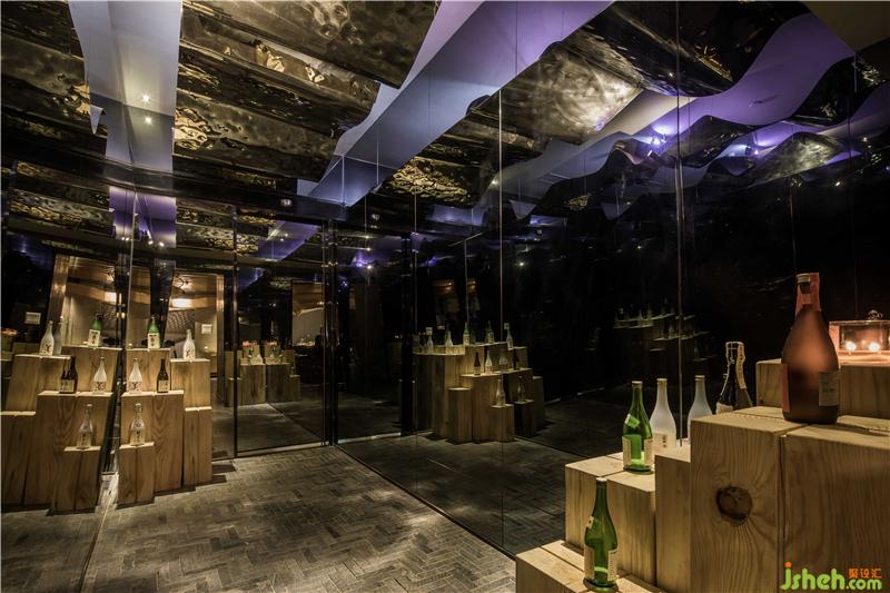 原有空间的狭长过道通过镜面不锈钢光反射的原理,扩大了视觉上的空间效果,凹凸起伏的钢面吊顶犹如波浪般荡漾,加以紫色的灯光科技感十足,亦充分利用空间成为酒品展出的最佳位置,契合设计美感与实用性。餐厅装修设计
