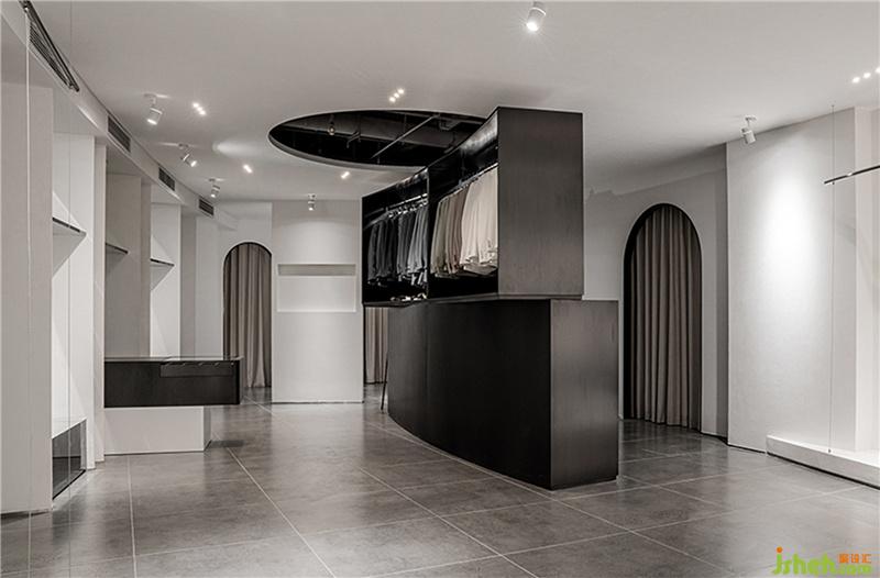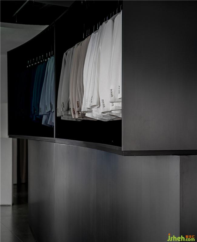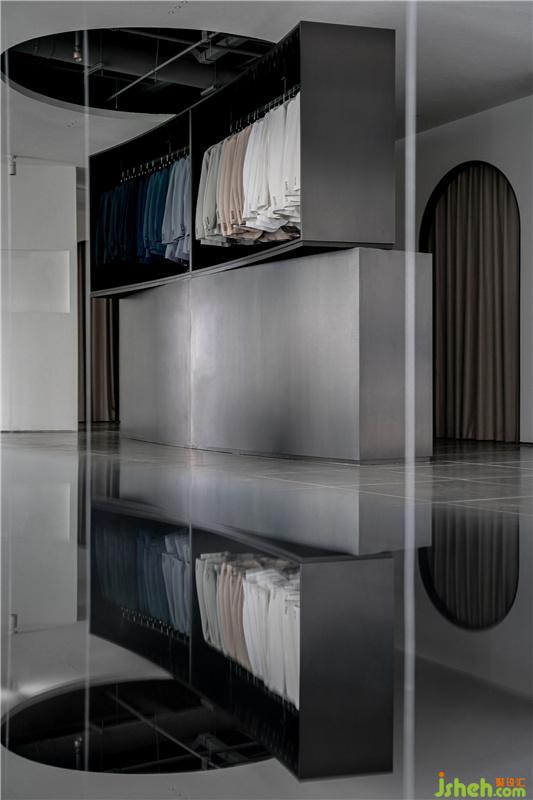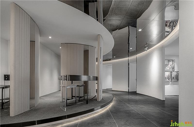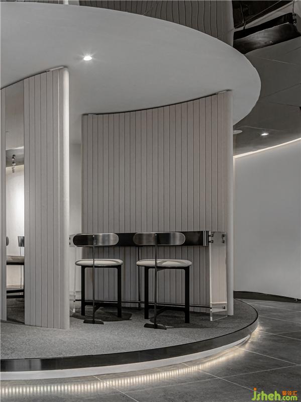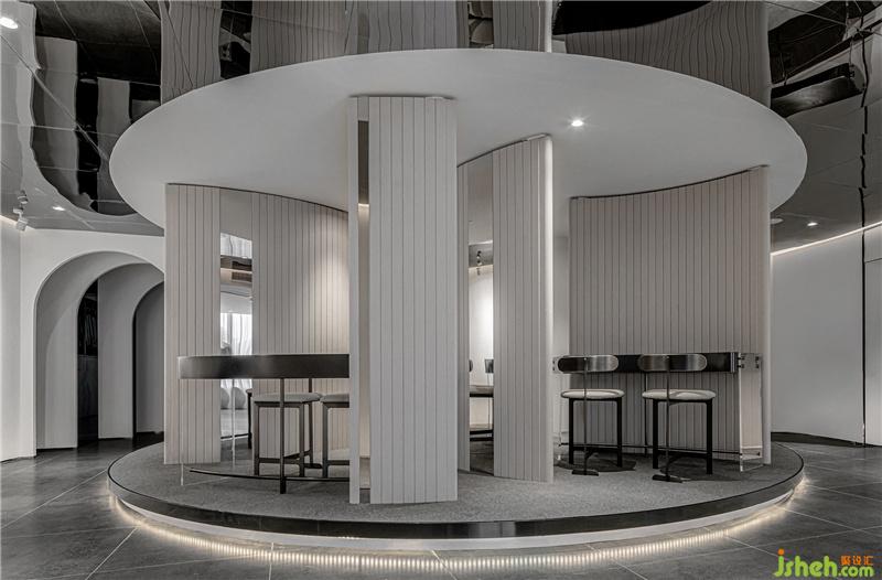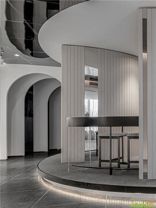 弧形的金属板建造,流露出经典而浪漫的一面。过廊左右分设化妆间与展示区,层次贯穿加重了视觉体量感,完美地融合了顶面和地面。简约大方而又富有设计感,柔美中渗透着庄重感。