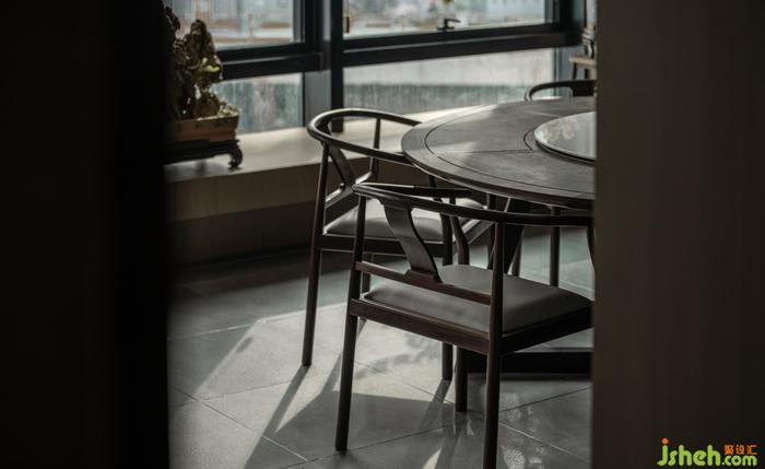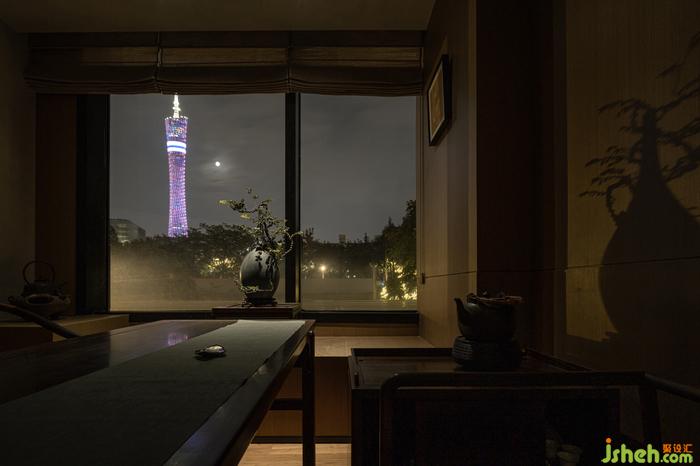 设计师以中国古典园林的借景手法,通过窗户框定广州塔的夜景,闹中取静,从中获得一个静谧文雅空间。