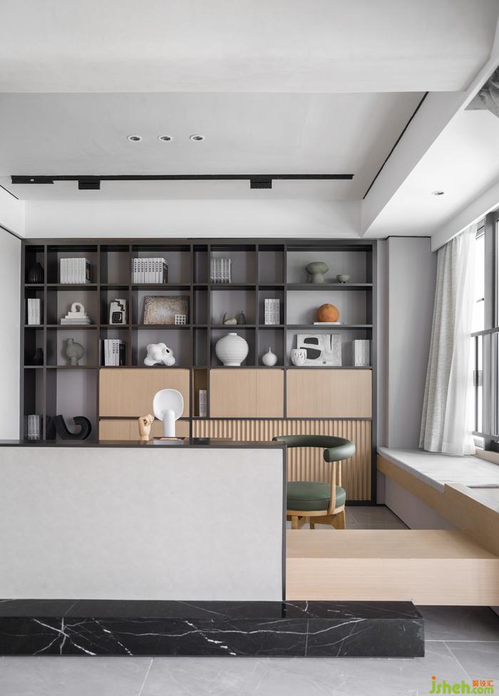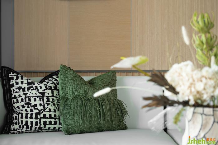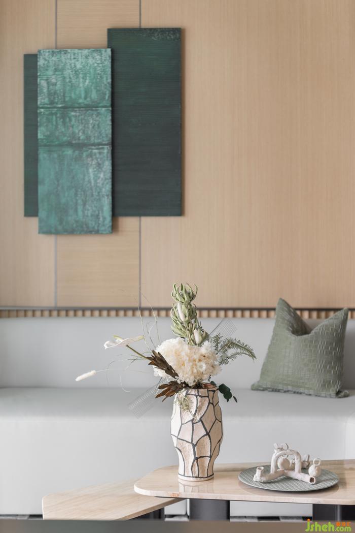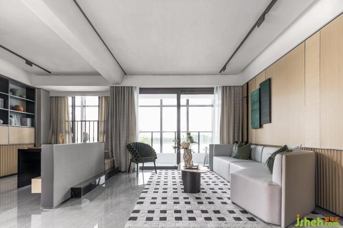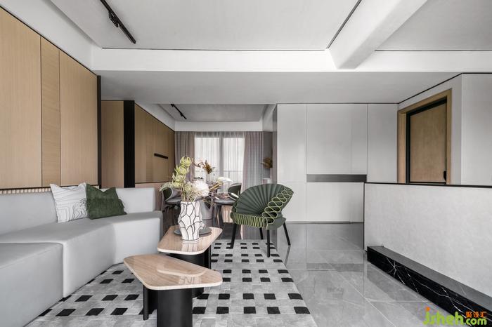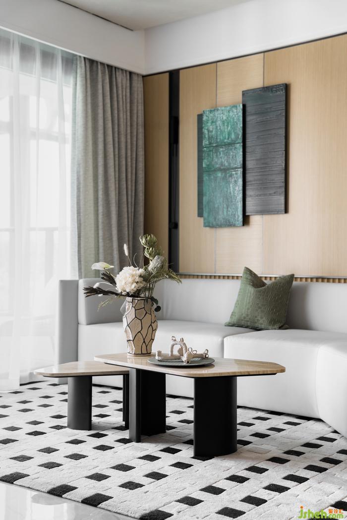 对于交流和共享属性更高的的客厅,样板间设计师在陈设上降低空间视觉重心,选用低矮沙发和家具,强调谈话交流的亲密感与舒适度。在多种材质与色彩的混搭下,设计开启生活多元的空间体验。