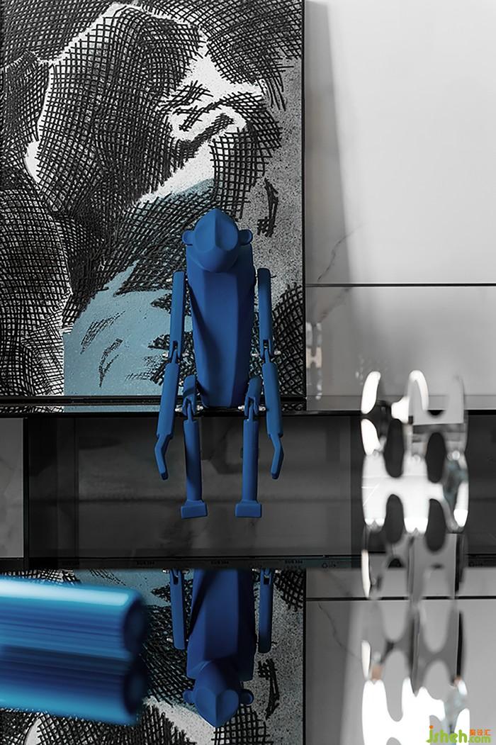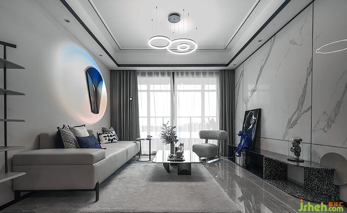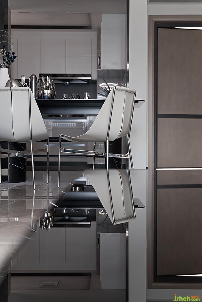 造型新奇的绚丽灯饰,光亮的金属,打破咖色木材质和大理石材质的中性,样板间设计让空间的氛围趣味且跳脱,打破了同质化的设计思维所带来的沉闷与无味,构建艺术与功能并行的会客空间。