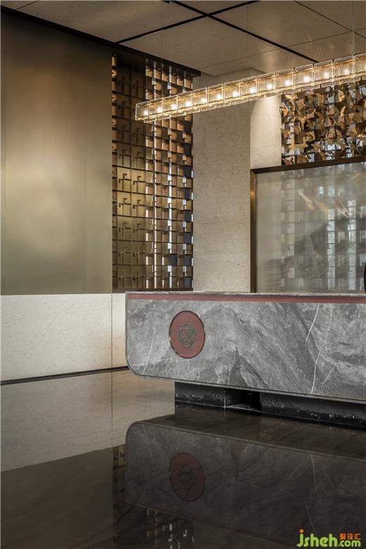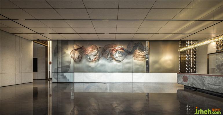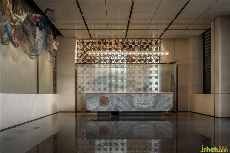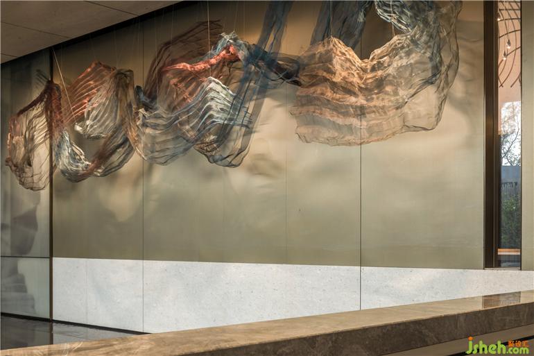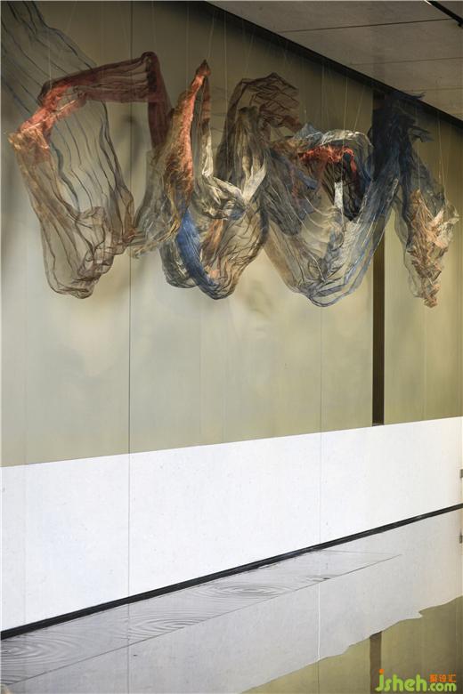 接待区不对称的设计手法将人们的视线聚焦于一侧,射灯下虚幻如飘纱的装置,灵动的姿态不仅仿照了鱼游的形,亦还原了香云纱在晒纱时随风摆动的形态,悬于空中又似云游,以香云纱传达出云游的方向,配合水波纹石材的地面,引导动线的深入,指引人们开启香云之旅。