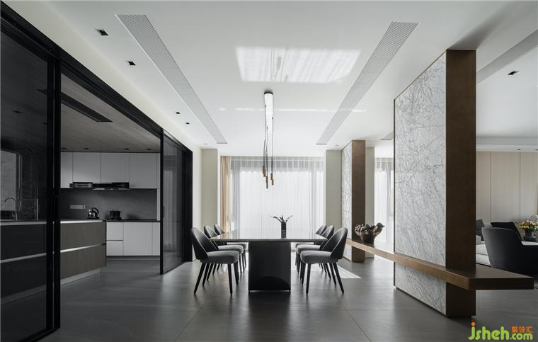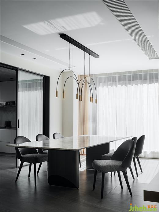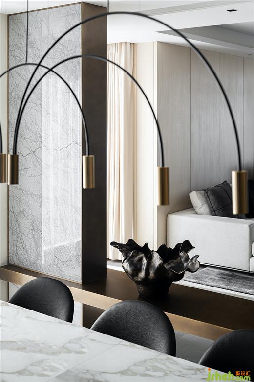 餐厅上方的灯与空间的配合也很是点睛,从厨房、餐厅、客厅这样一个大开间又独立存在的空间里,豪宅设计只感受到舒心、平和,空间里充满了现世安稳岁月静好的精致感受,这种情绪的表达,是技术性和自然心灵和谐的融合。