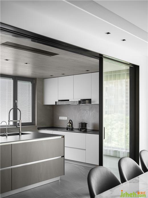 取消原有隔断,设计师将餐厅和厨房打通,增加了自然光线的引入,同时扩大了用餐视野,豪宅设计让空间的构成保持了一种更为开放和通透的可能性。当自然光纳入室内,流动的气韵交融,打破原有的界限。屋内屋外,人与自然,虚实相生,诗意升腾,让人能够静享当下。