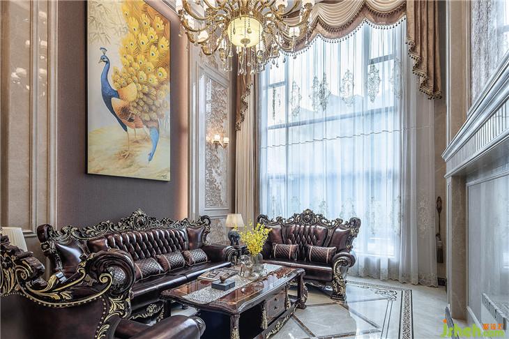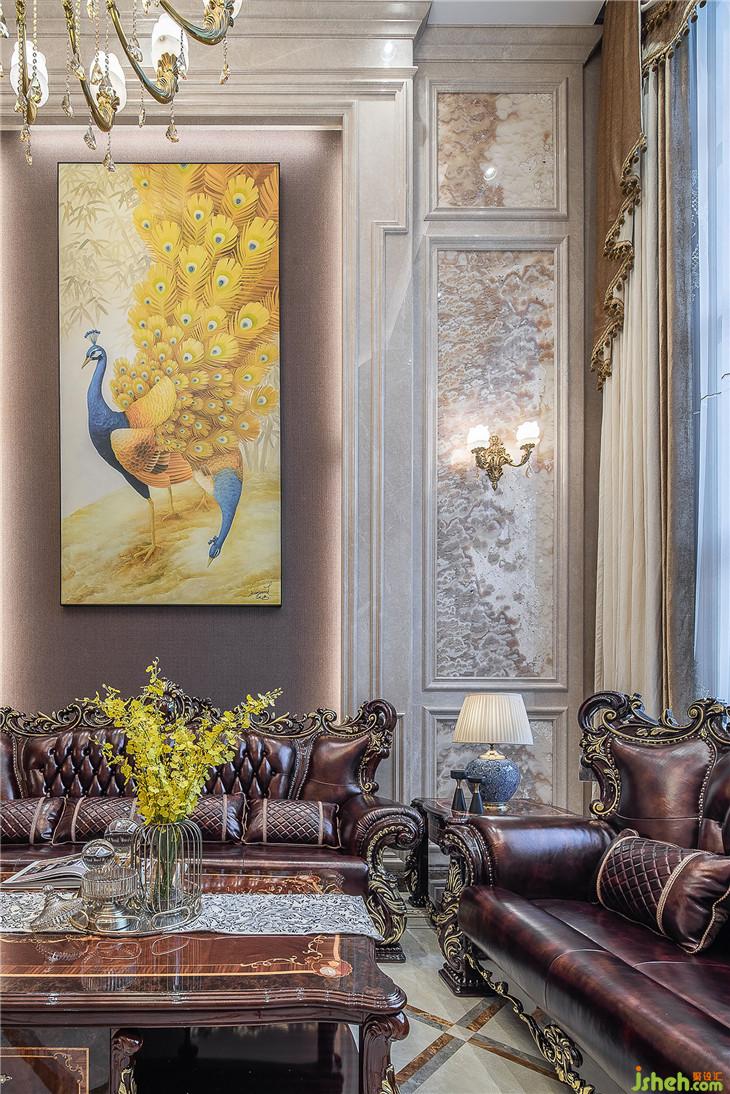 材质运用上,同色系软包背景墙衔接大面积的石材墙面,延展空间尺度的同时,充满转折的美感。深褐色的沙发摆放在一幅孔雀挂画前,整个空间的色彩层次丰富明朗。